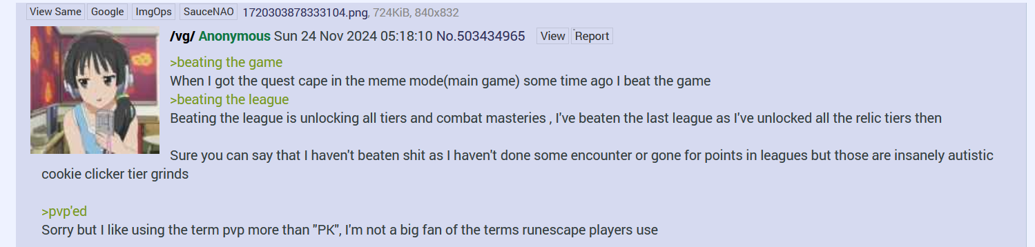 >>560140419im drifting a bit at the momenti played 2004scape up until legends quest then i just played some ironman mode PoE as well but that game has a ton of problems too, mostly bloat-- i'd liken it to rs3, and it turns my PC into a space heateri need to play Grim Fandango next but that requires too much of my full attention and since im a runescape player i need to be multitasking 17 diff things while doing anything so it's hard to carve out time to dedicate to that, but as a general rule of thumb i think older games are the way to go