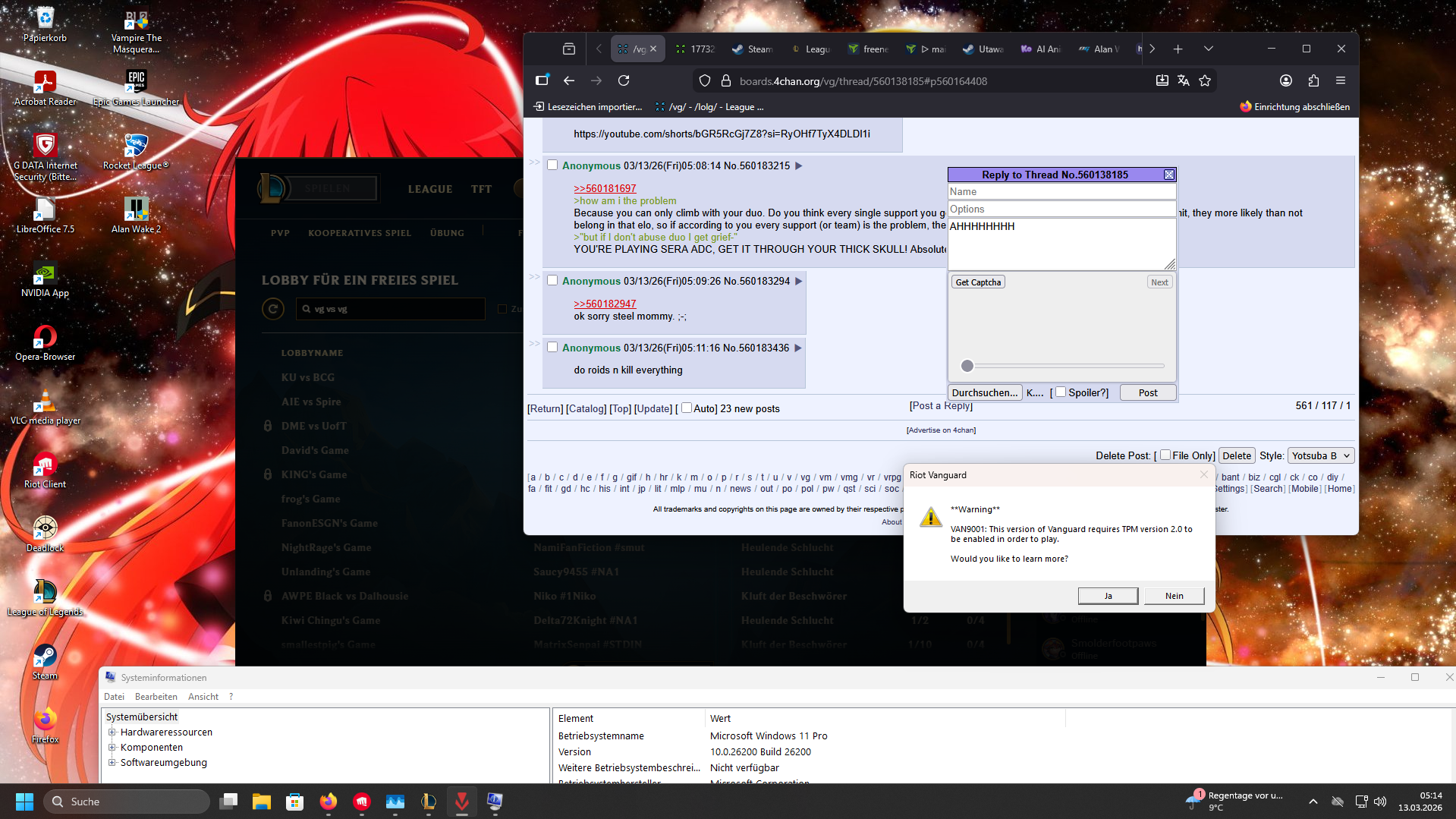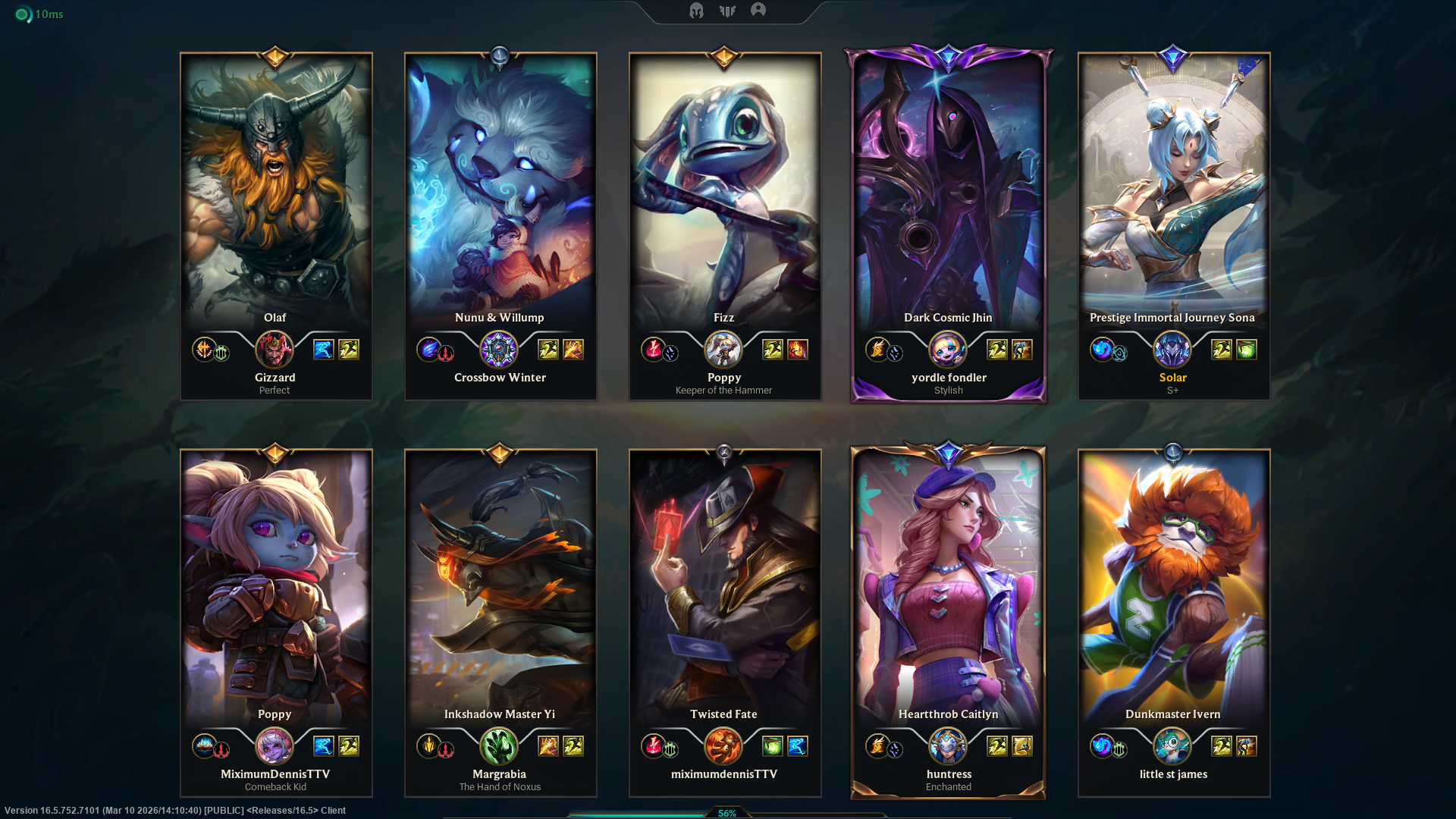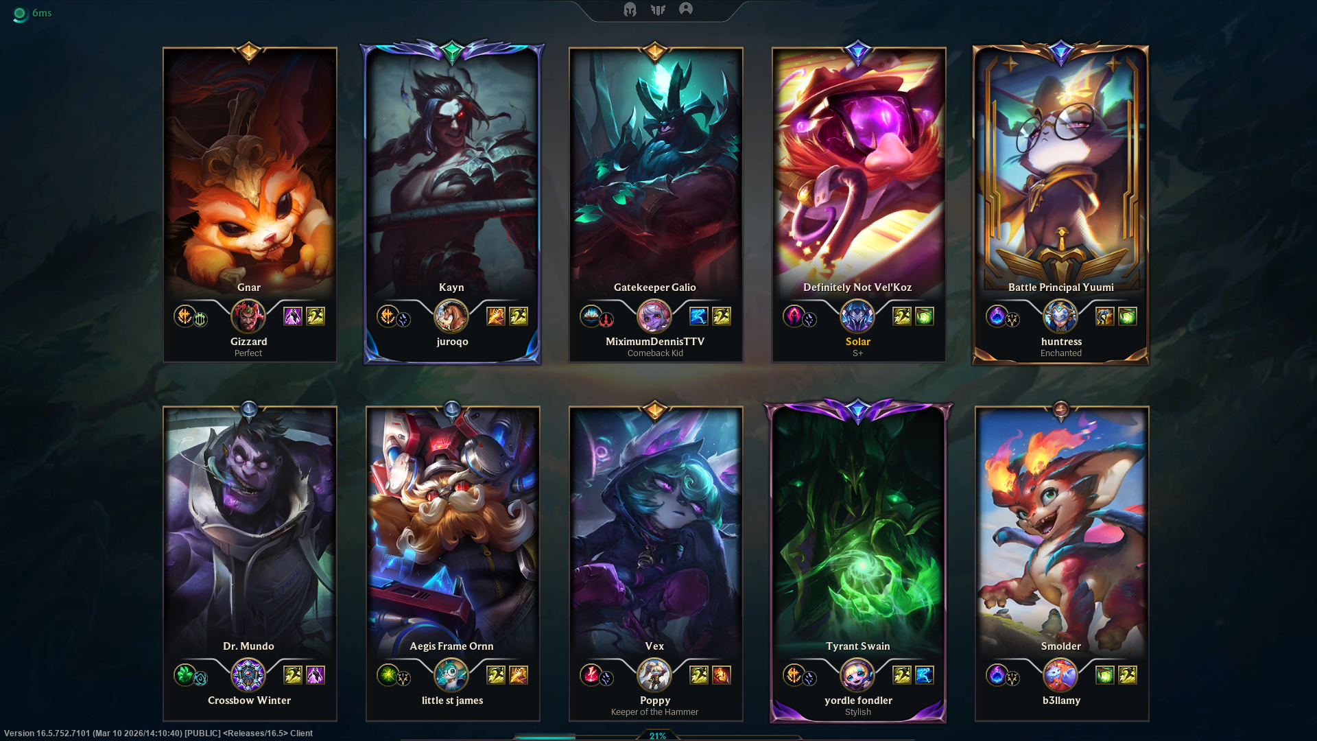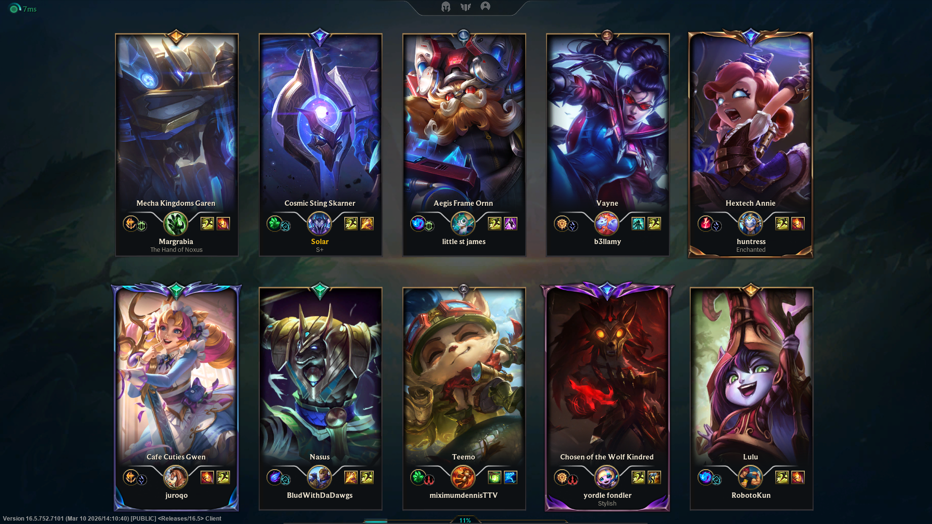 Previous: >>560056186>Current & Upcoming ContentPatch 26.05 (Mar 4, 2026) liveSeason 2026 - Season 1: “For Demacia”Act 2 Battle Pass now available (missions, tokens, cosmetics)New skins: Corrupted Petricite Maokai, Corrupted Petricite Xerath, Prestige Requiem SonaPatch 26.06 - Mar 18, 2026Patch 26.07 - Apr 1, 2026Patch 26.08 - Apr 15, 2026Next new champion delayed until Season 2 (expected May 2026)Riot focusing on MSI patch and balance updates first>EsportsFirst Stand 2026 - Mar 16 - 22 (São Paulo, Brazil)Group A: Bilibili Gaming (LPL), BNK FearX (LCK), G2 Esports (LEC), Secret Whales (LCP)Group B: Gen.G (LCK), JD Gaming (LPL), LYON (LCS), LOUD (CBLOL)Daily start times: EU 14:00 & 19:00 CET | NA 9:00 & 14:00 ETMar 16 - Group A Day 114:00 CET / 9:00 ET - Bilibili Gaming vs BNK FearX19:00 CET / 14:00 ET - G2 Esports vs Secret WhalesMar 17 - Group B Day 114:00 CET / 9:00 ET - Gen.G vs JD Gaming19:00 CET / 14:00 ET - LYON vs LOUDMar 18 - 20 - Group Stage continues (TBD)Mar 21 - Semifinals (TBD)Mar 22 - Grand Final (TBD)>NA VGSNa VGS are returning on march 15th 2026 under a new hostWe are coming back stronger than ever.Make NA great again.>Weekly chroma rotationStar Guardian TaliyahRuined ShyvanaSentinel PykeDark Star MordekaiserSpirit Blossom SyndraSpirit Blossom YorickPorcelain LuxHeavenscale Janna>Official Wiki, Patch Notes and PBEhttps://wiki.leagueoflegends.com/en-us/>Builds/Account Statshttps://u.gg/https://www.op.gg/https://lolalytics.com/>Model Viewerhttps://www.modelviewer.lol>/lolg/ Leaderboardhttps://dpm.lol/leaderboards/2f32736c-e08f-4f2b-aae6-3f3326cabd9b>/lolg/ SS13 serverhttps://ss13.moe>Relaxing music for frustrating gameshttps://www.youtube.com/watch?v=kgq5yDGVvQ0https://www.youtube.com/watch?v=5clXACeob_khttps://www.youtube.com/watch?v=IknOkgId8P8>/lolg/ OP pastebinhttps://pastebin.com/EXiVGIGqDX