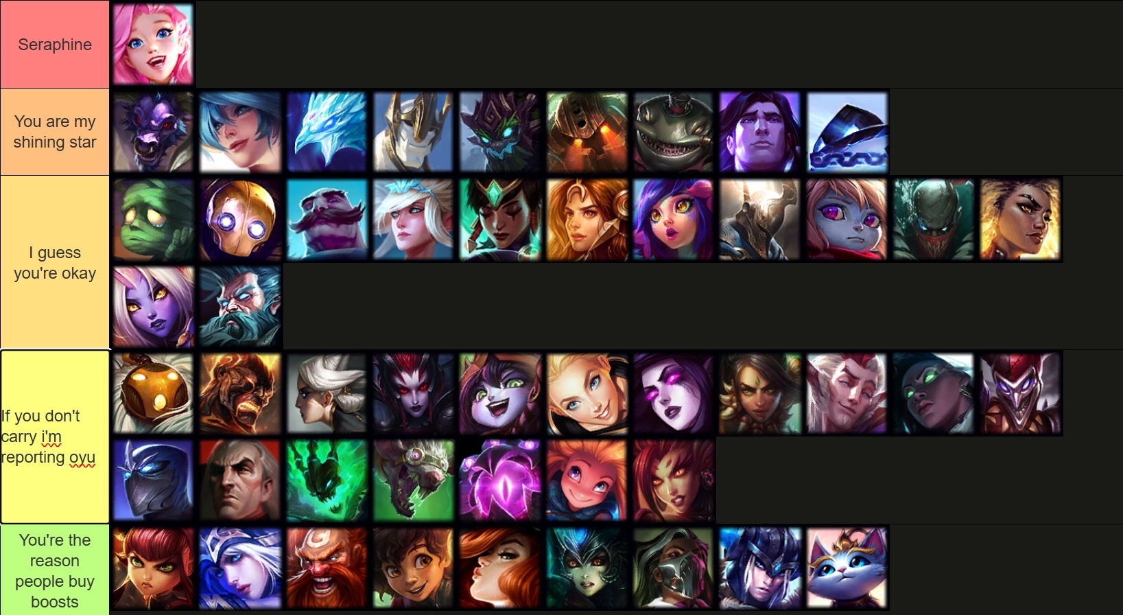 SSS tierSeraphineS tierKindredA tierAuroraSonaGwenB tier Taliyah C tierLuxYunaraSyndraD tierLillia