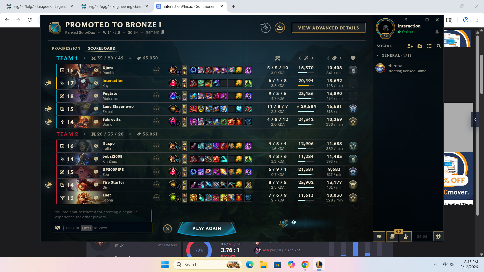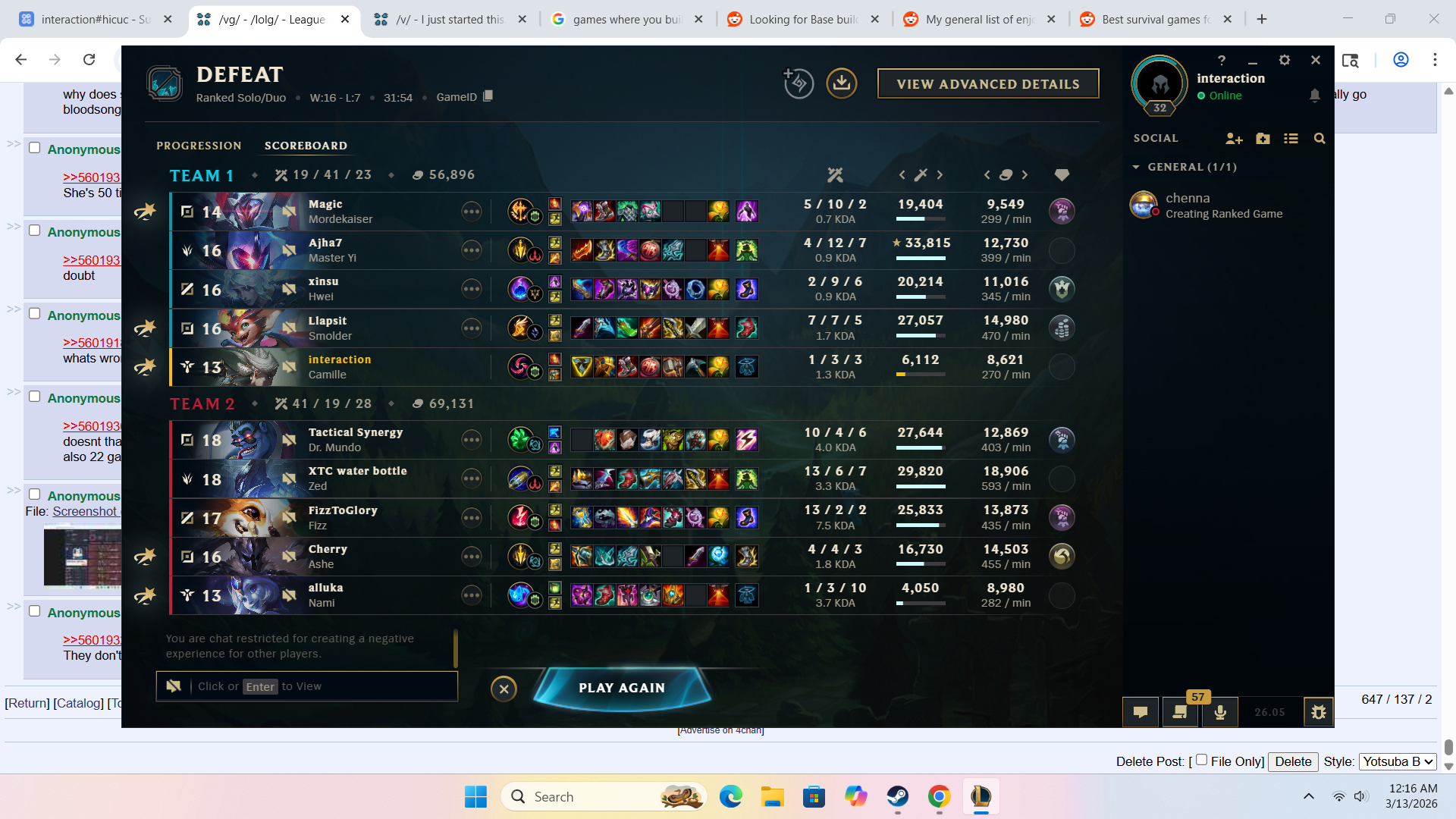 >>560199121It is NOT worth the headache, in comparison I'd prefer playing jungle if I really have to choose between the two. It's too dependant on the support.Like, first wave, second wave hasn't even arrived yet, and this Malphite flash engages on lv1 when the enemy both is Twitch Lulu. We literally don't have a lv1 botlane, we have a lv6 combo that is definitely better, I even have Exhaust on top of playing Ashe. Why would we engage lv1? Not even 2, we can contest lv2 just so we don't lose pressure but not trade. We just needed to have patience.This is what I mean when I say it, every stupid time, that botlaners don't know how to play safe.Welp, guess I'm one game from demoting Gold, demotion shield warning on 0lp.