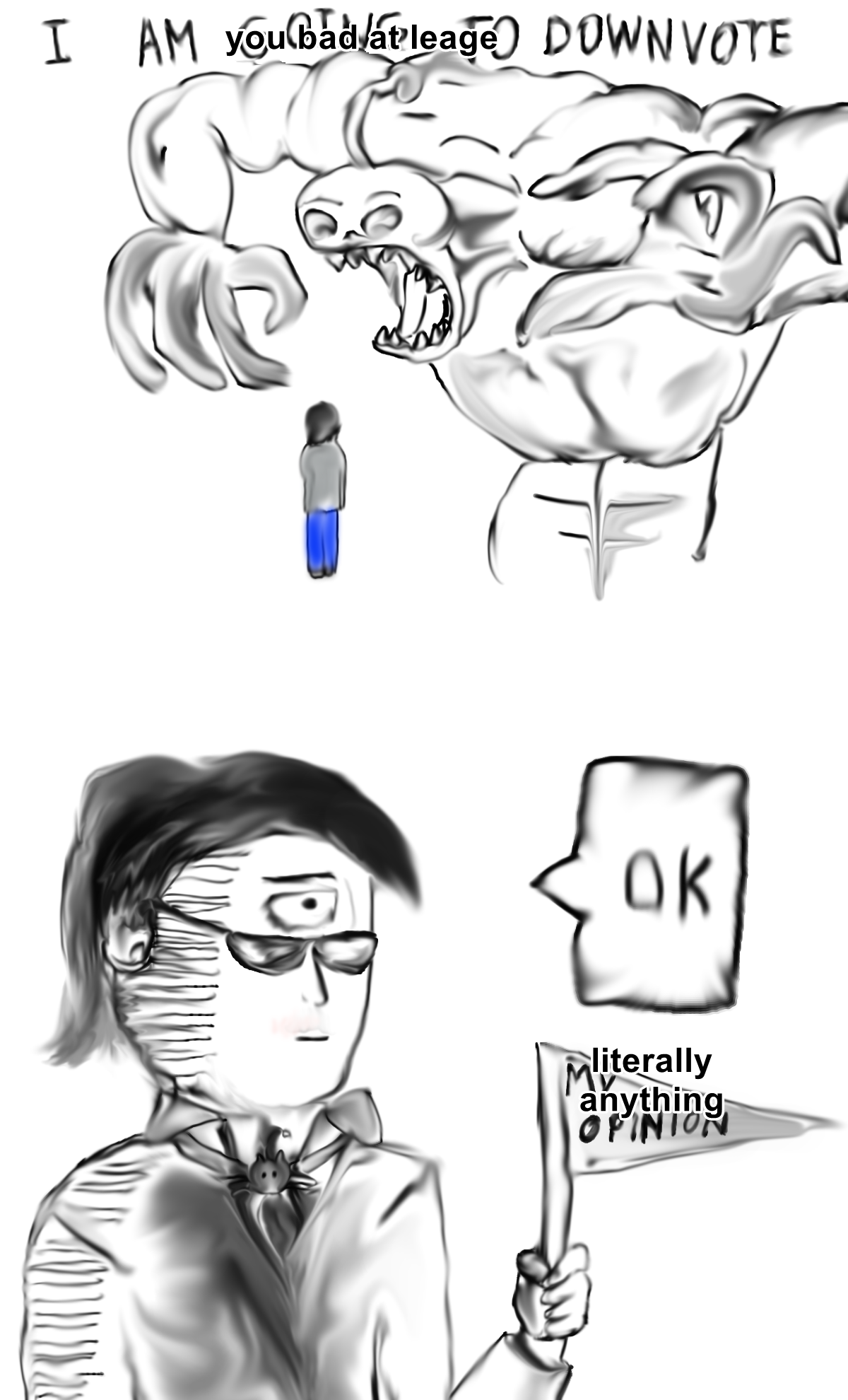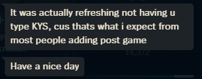 >>560200265maybe you are just corrupted. i never really leaned to the spamming kys meme or your attempt at self desperation which still wrong btw. You can banter but there should always be a limit. i am not even restraining myself. i just genuinely don't use those words by default and by habit because even if i am at my lowest i control myself.