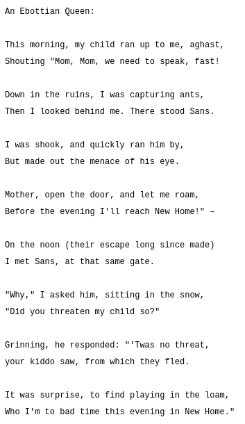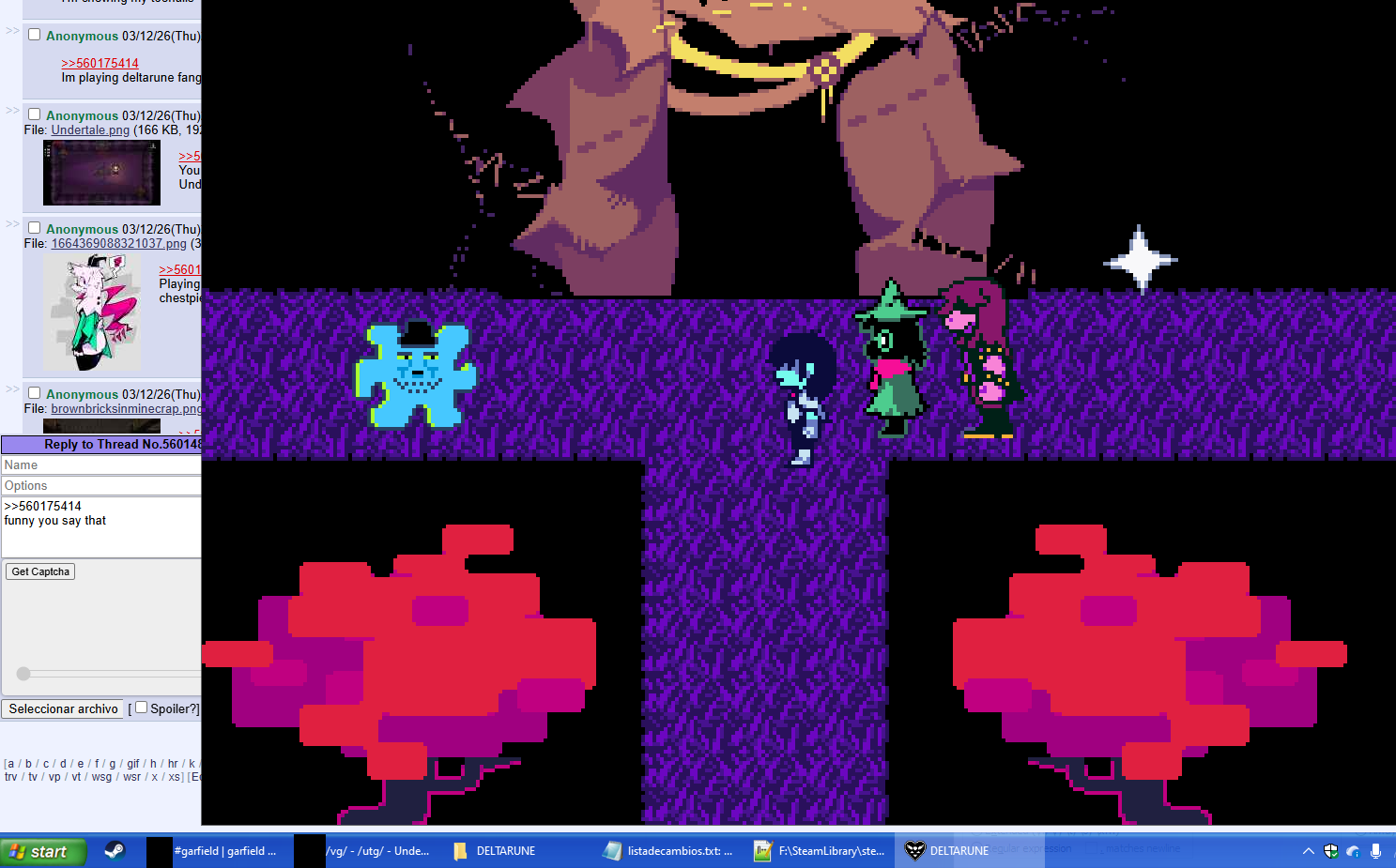 Clumsy editionPrevious accidents: >>560088637 Spoilers ahead, proceed at your own Frisk.-DELTARUNE CHAPTER 1-4>https://store.steampowered.com/app/1671210/DELTARUNE/-The Old Game>https://undertale.com-The Old Game's Demo>https://undertale.com/demo-The New Game>https://deltarune.com-The New Game's Progress>https://toby.fangamer.com/newsletters/winter2025/>https://toby.fangamer.com/newsletters/>https://deltarune.com/#news>https://www.twitlonger.com/show/n_1sqn3p9-Merch>https://www.fangamer.com/collections/undertale>https://www.fangamer.com/collections/deltarune-Books-Undertale Artbook>https://pastebin.com/1MRmU0Gk-Legends of Localization - Undertale>https://pastebin.com/DkZaXMpi-Extra Content>https://undertaleqa.tumblr.com>https://undertale.com/alarmclock>https://deltarune.com/sweepstakes/>https://toby.fangamer.com/newsletters/-Undertale/Deltarune Text Dumps & Screenshots>https://pastebin.com/WG9u1fvH-Undertale Image Collections>https://pastebin.com/g2JqH6Ba-Booru>https://utg.vidya.pics/-Recommendbin>https://pastebin.com/fsqd5Sa6-Writebins>Current: https://docs.google.com/document/d/1ZaYVvltQ_Rmf-ggszf1bwmYDW2NUcfpTYU7JzfyMhVE>Old: https://writebin.surge.sh-Comicbin>https://pastebin.com/UJpBYSEE-Fangamebin>https://archive.is/iSiFg-/vg/ League team>https://implyingrigged.info/wiki//utg/-Wanna change the font?>https://rentry.org/utg-font-Current whiteboard: https://r9.whiteboardfox.com/95860275-2044-6921-Previous whiteboard: https://r2.whiteboardfox.com/25513136-2769-4770-Magma: https://magma.com/d/QiFH9rWyRh-WorldOfText: https://ourworldoftext.com/utg-Pippins Wiki>https://utg-pippins-ocs.neocities.org-Thread Template (make sure to paste the current whiteboard links)>https://pastebin.com/rTN8SxAw