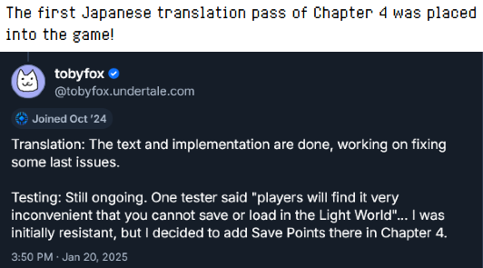 The Japanese Translation of Deltarune Chapter 4 was finished in a month (outside of issues) after getting its first draft. We might be getting an update on Chapter 5's translation next week.
