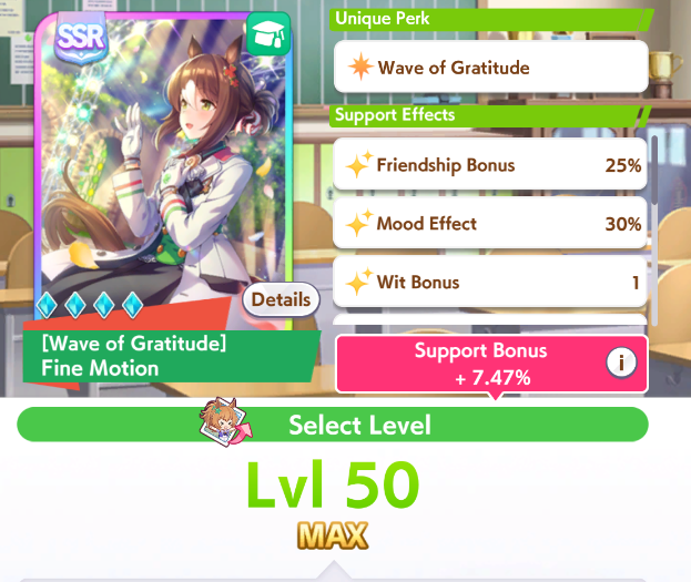 Current Rate Up Support Cards: Kawakami Princess (Speed), Fine Motion (Wit), Narita Top Road (Speed), SR Admire Vega (Guts), SR Mejiro Ryan (Stamina), SR Bakushin (Power)