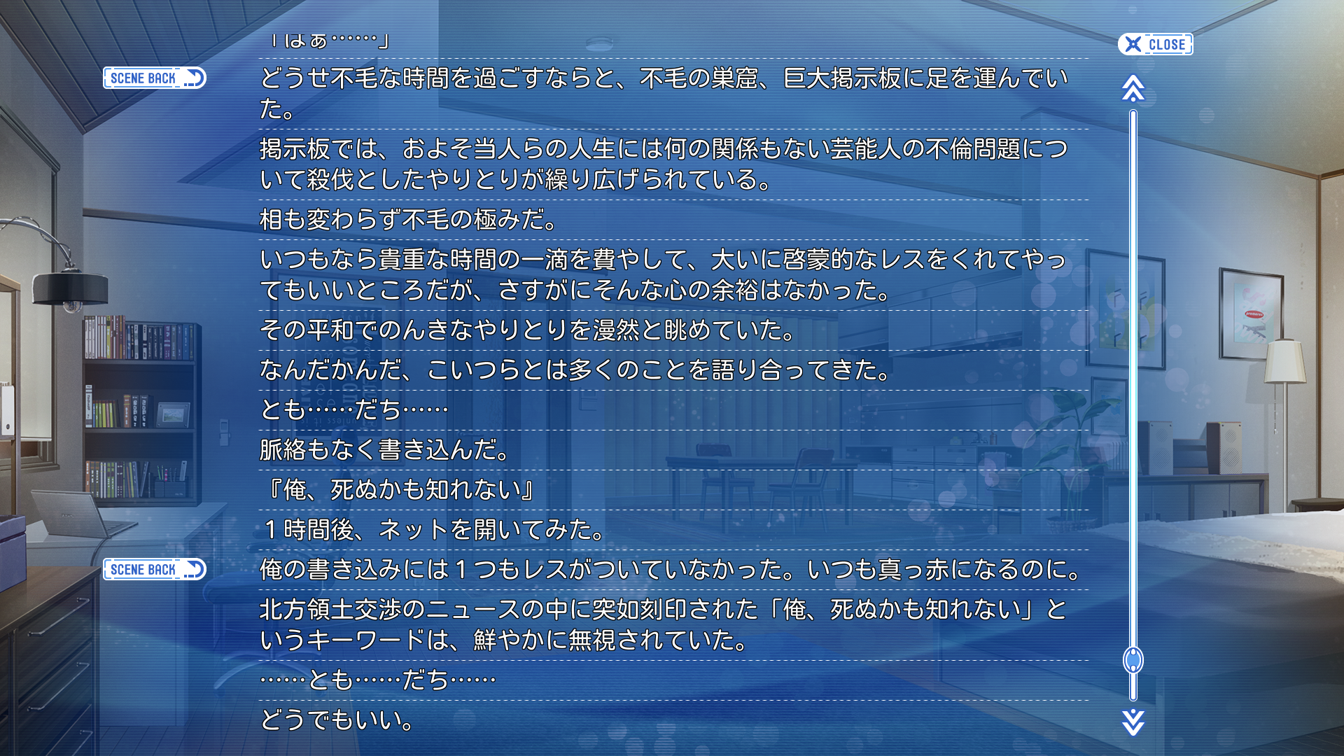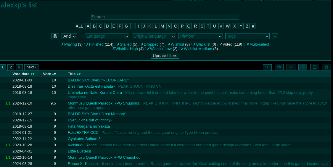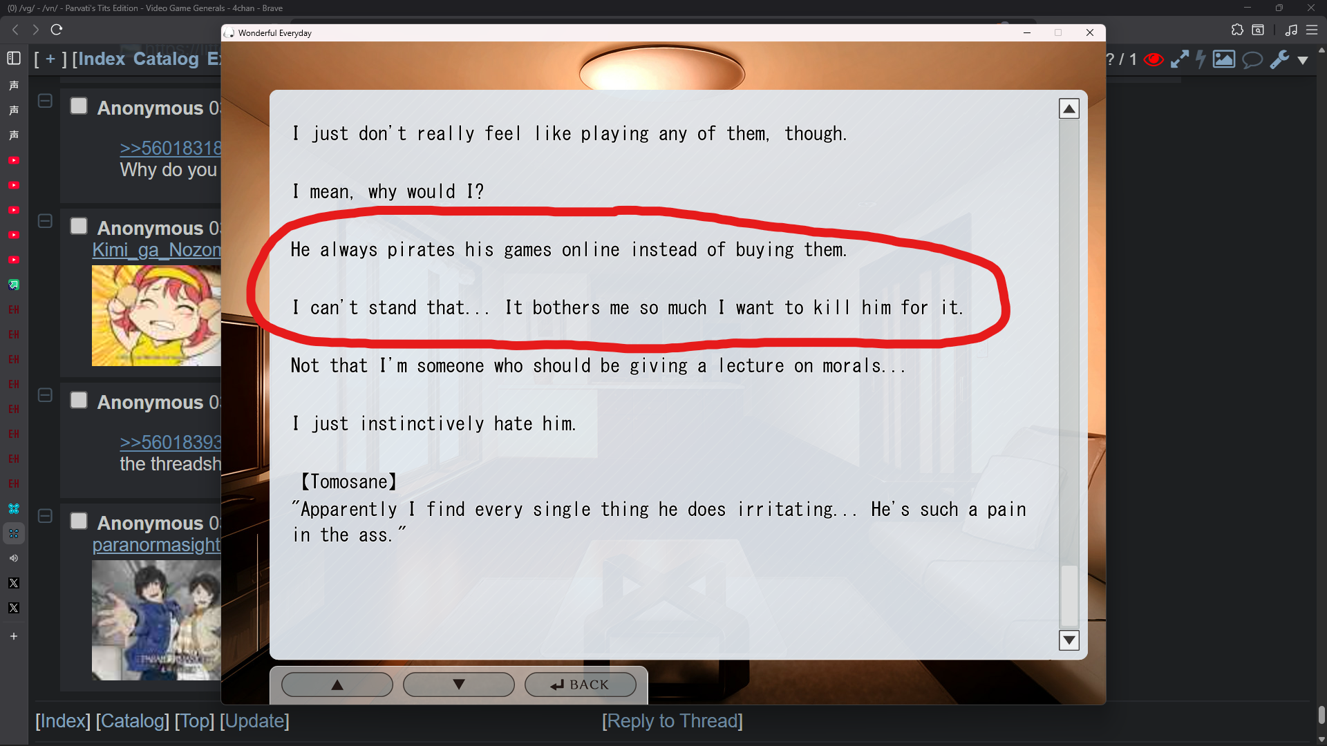 Visual Novel General #7479This general is for the discussion of English-translated Japanese visual novels.All posting of untranslated visual novels belongs on >>>/jp/E-celeb shitposting is not allowed.Kindly use spoiler tags appropriately when discussing plot spoilers to facilitate smooth discussion.>Having trouble with your VN? Try the following before you ask for tech support:1. Be in Japanese locale2. Read the Readme3. Check https://rentry.org/4chan-vn-help4. Copy error messages with CTRL+C and paste them with CTRL+V into DeepL5. Google it>FAQs, Recommendations, and Other Useful Things:https://chartanon.github.io/moechart/https://files.catbox.moe/j3dd0n.pnghttps://github.com/marisukukise/japReader>Need a novel with a specific element?https://vndb.org/g>Download Links:https://rentry.org/4chan-vn-linksPrevious thread:>>Visual Novel General #7478This general is for the discussion of English-translated Japanese visual novels.All posting of untranslated visual novels belongs on >>>/jp/E-celeb shitposting is not allowed.Kindly use spoiler tags appropriately when discussing plot spoilers to facilitate smooth discussion.>Having trouble with your VN? Try the following before you ask for tech support:1. Be in Japanese locale2. Read the Readme3. Check https://rentry.org/4chan-vn-help4. Copy error messages with CTRL+C and paste them with CTRL+V into DeepL5. Google it>FAQs, Recommendations, and Other Useful Things:https://chartanon.github.io/moechart/https://files.catbox.moe/j3dd0n.pnghttps://github.com/marisukukise/japReader>Need a novel with a specific element?https://vndb.org/g>Download Links:https://rentry.org/4chan-vn-linksPrevious thread:>>560014126