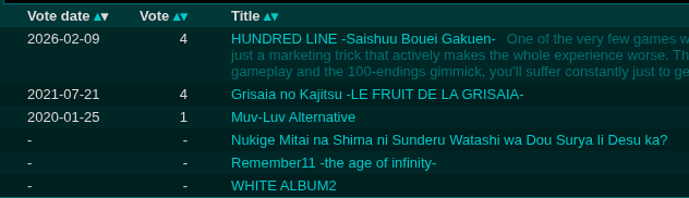 >>560169289>Ofc VNs are harder to rate VERY highly, because they are more like books and it's harder to be completely engaged with them compared to "real" videogames.Why are zoomies like this?