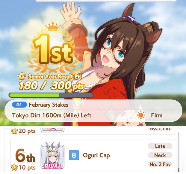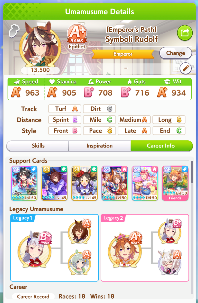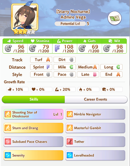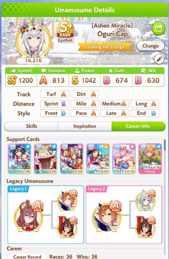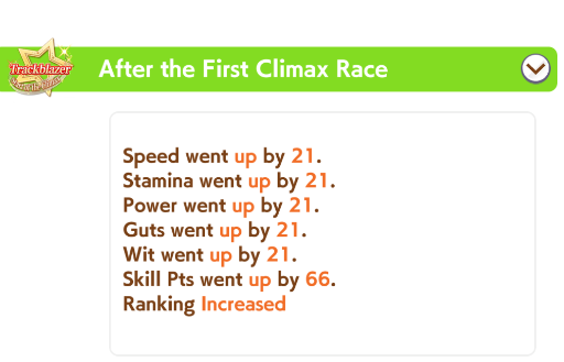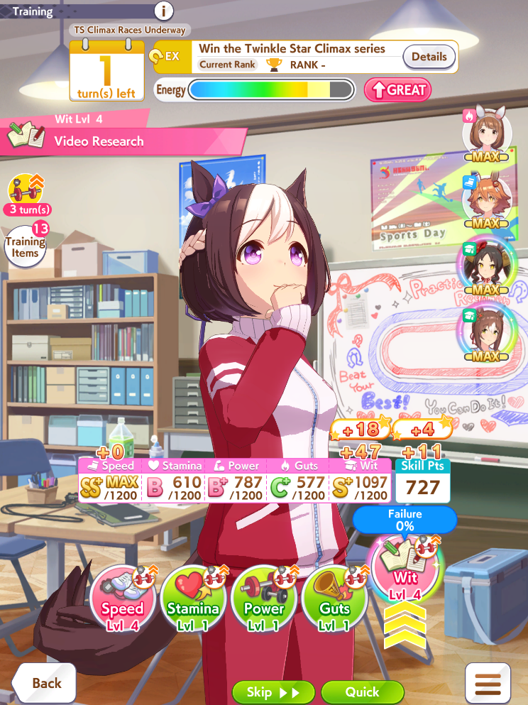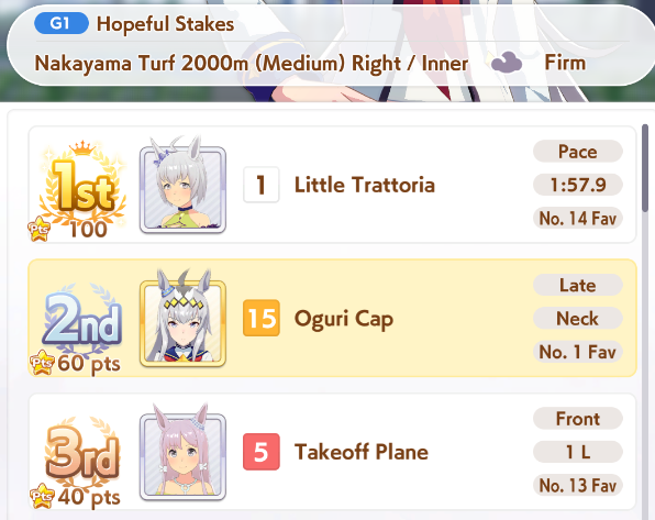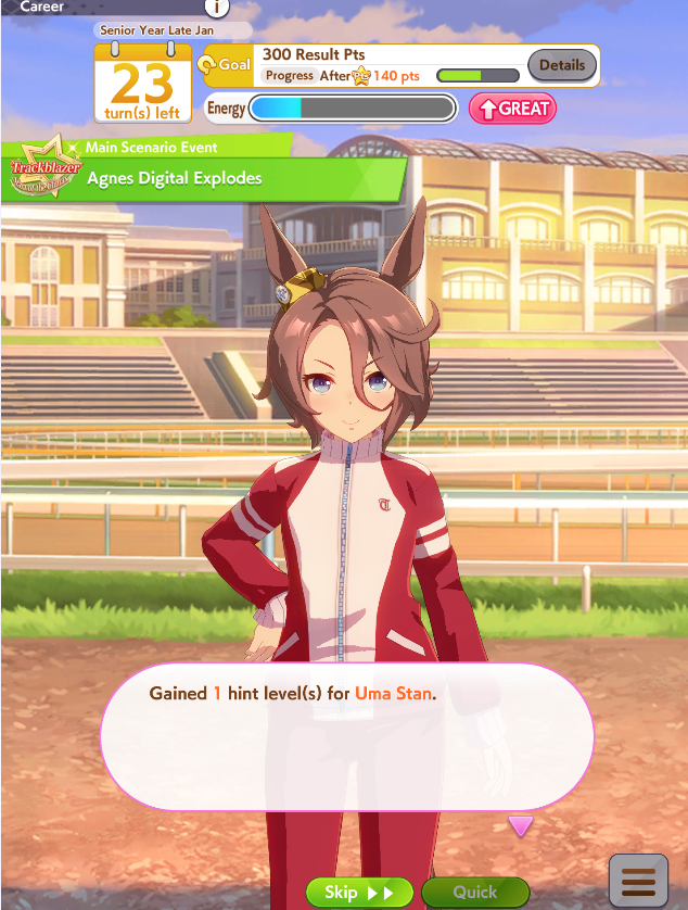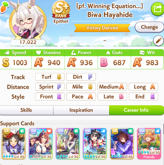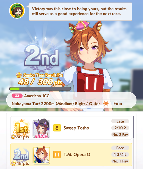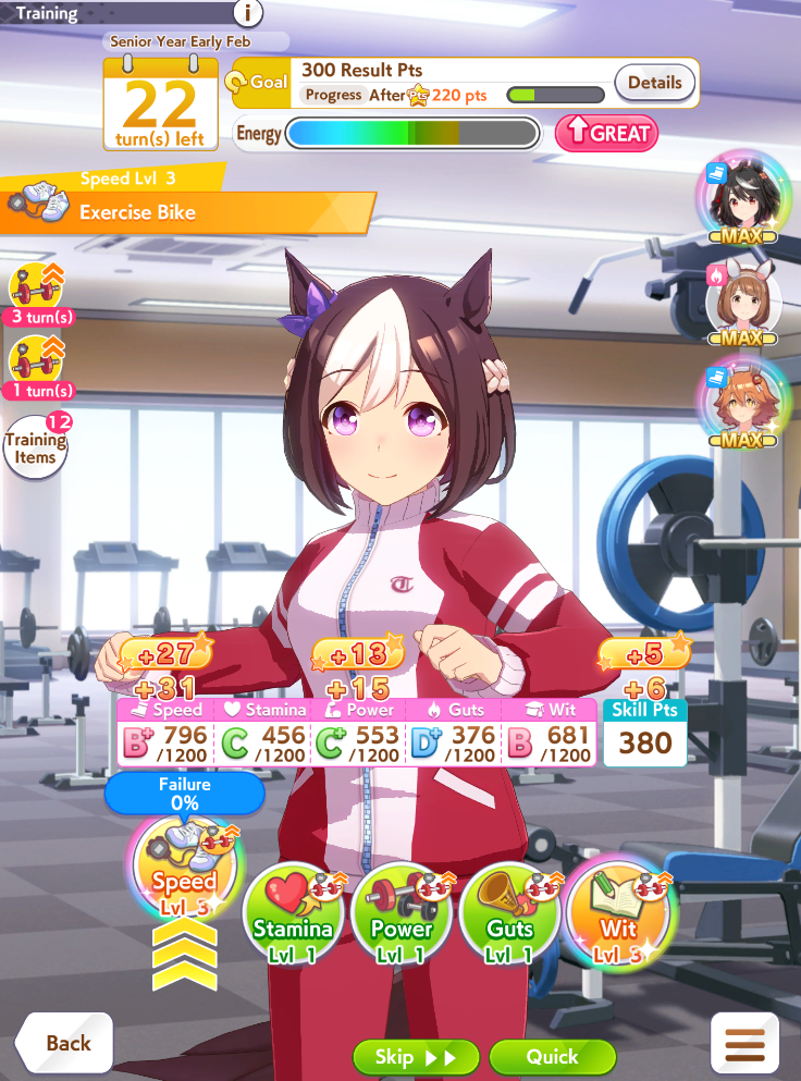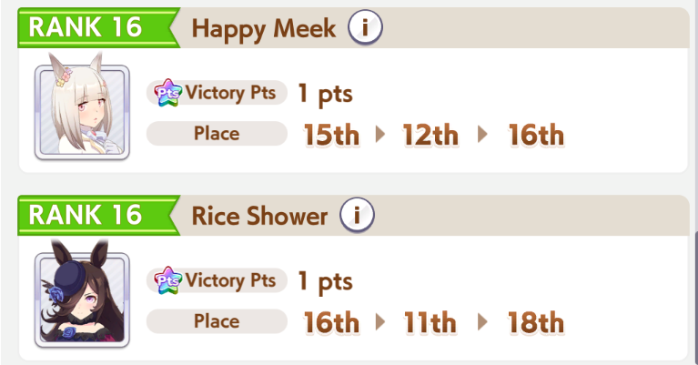 Getting a Pisces ace out of this will be pretty tricky but I can see the potential for sure. I think I actually raced too much and didn't train enough, my facilities were super low level at the end and I wasn't able to make very good use of summer camp due to lacking energy drinks.