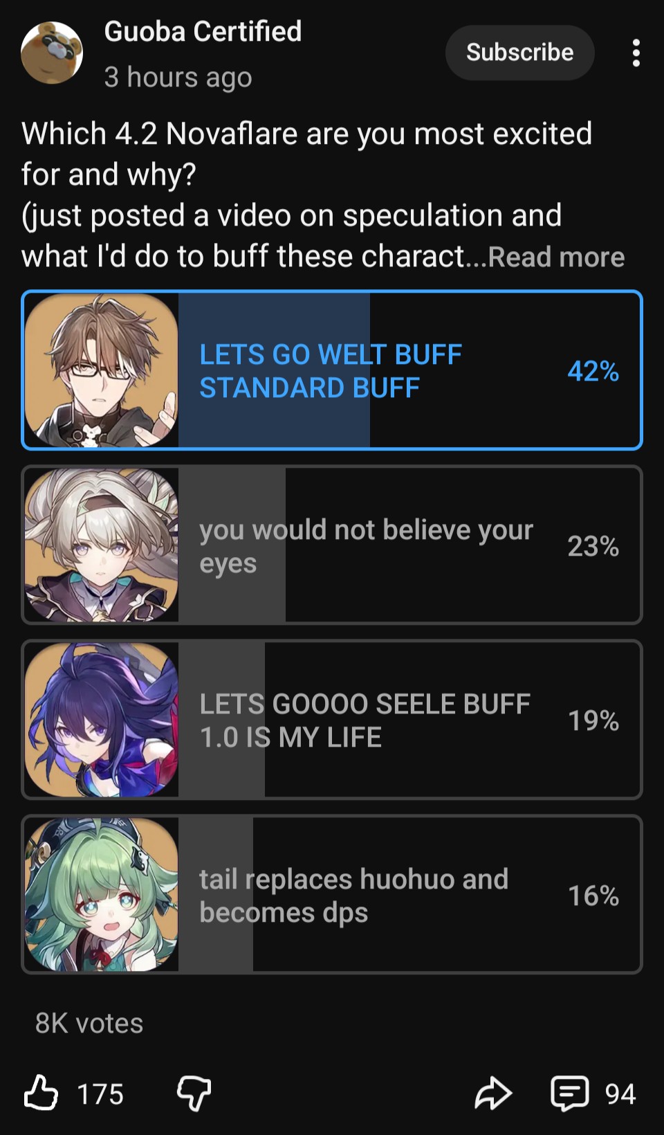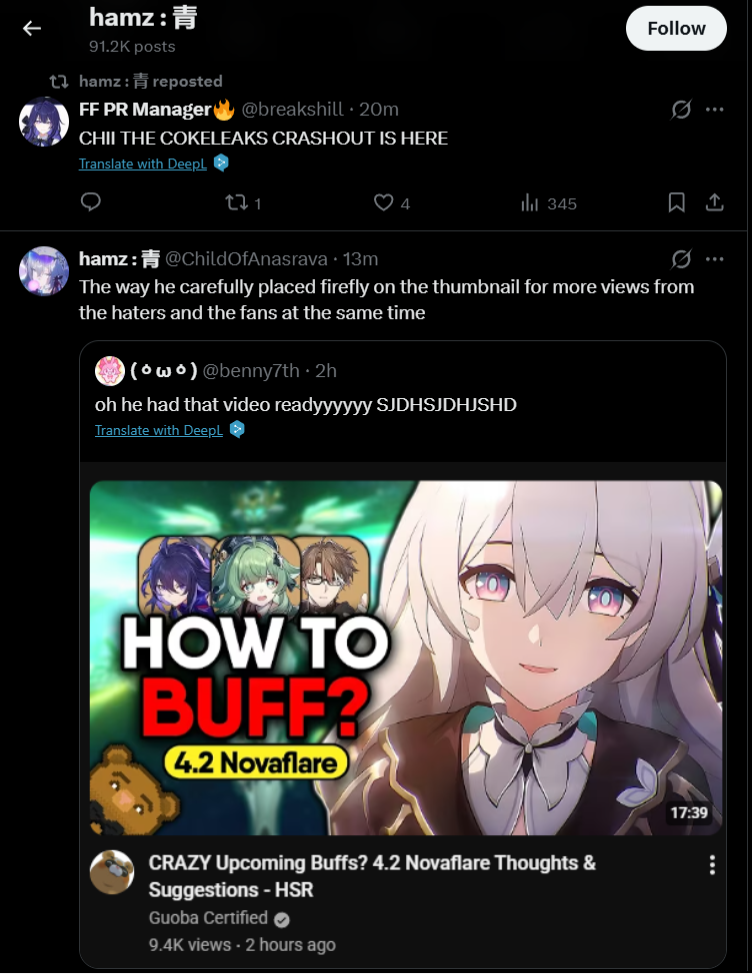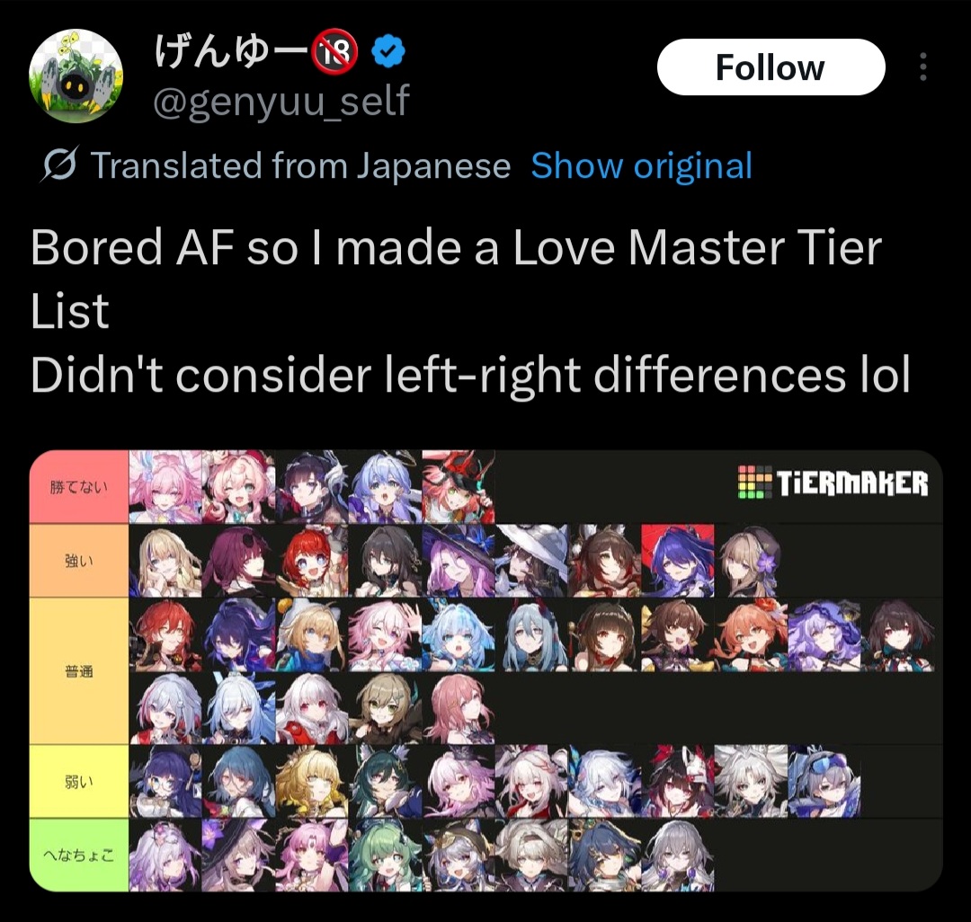 >>560196250To be fair, it goes both ways. Phainon has 157k likes on twitterhttps://x.com/houkaistarrail/status/1919603026433921379Meanwhile other recent popular tweets has Sparxie at 154khttps://x.com/houkaistarrail/status/2006938500877152562/photo/1But I really really doubt that sparxie will ever reach a third of phainon's numbers. What the community likes and what whales actually spend on is a very different matter. People can love a character but if they have bad eidolons or LC, there's really no reason to spend more on them.