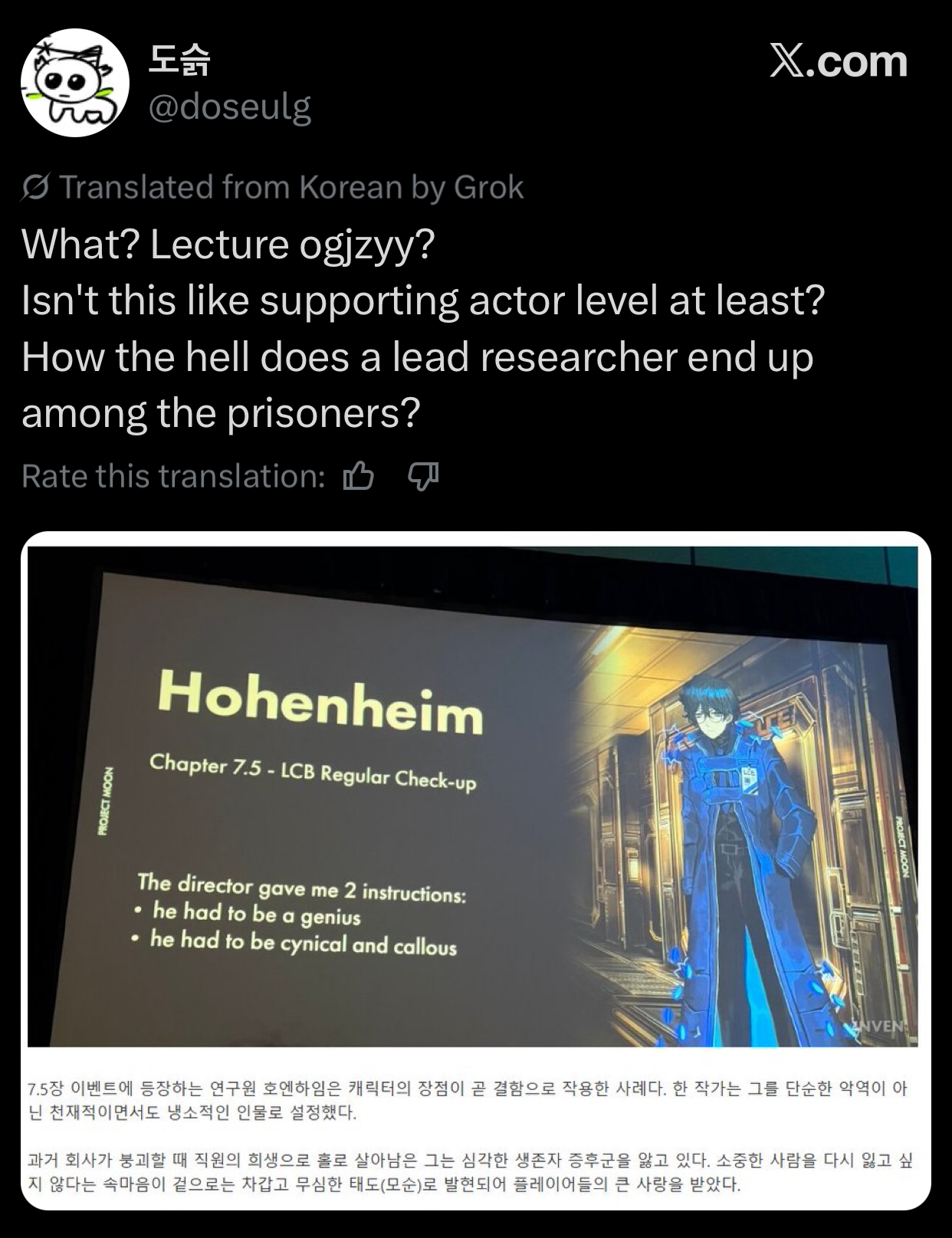 >>560216509https://www.inven.co.kr/webzine/news/?news=314362According to the article those sinners were used as examples of characters that KJH believed were different from their usual character archetypes>Notably, Faust, the smartest genius character in the group, reveals underlying anxiety contrary to user expectations that he would always be arrogant. Heathcliff appears simple, rough, and full of rage, but demonstrates quick situational judgment and leadership in times of crisis. Sinclair is always a timid and cowardly young man, yet suddenly displays a fierce and ferocious side. Meursault is depicted as the most taciturn member of the party, using stiff, formal language.