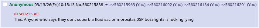 >>560215363This. Anyone who says they dont superbia fluid sac or morositas 0SP bossfights is fucking lying