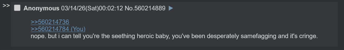 >>560214736>>560214784nope. but i can tell you're the seething heroic baby, you've been desperately samefagging and it's cringe.