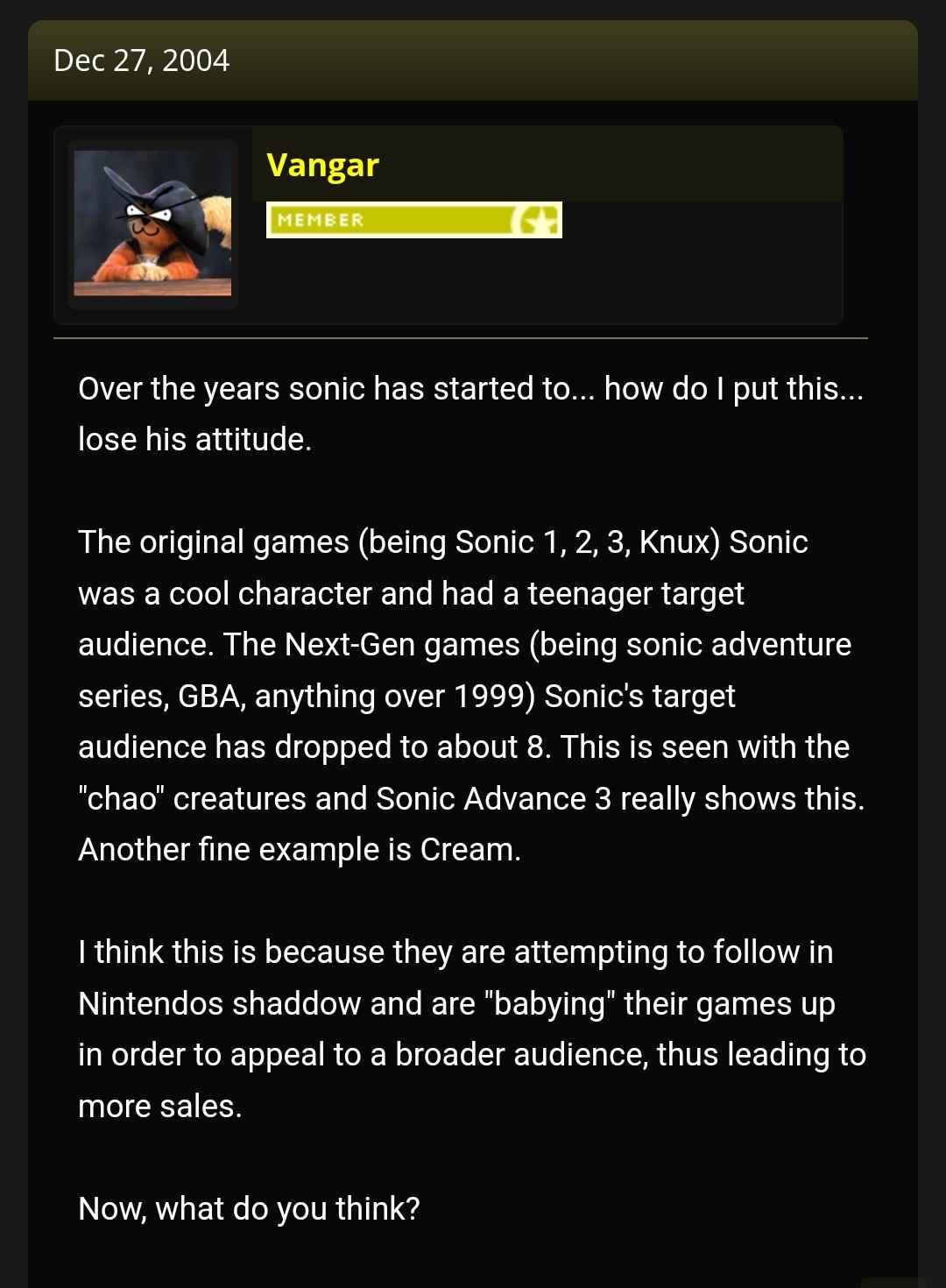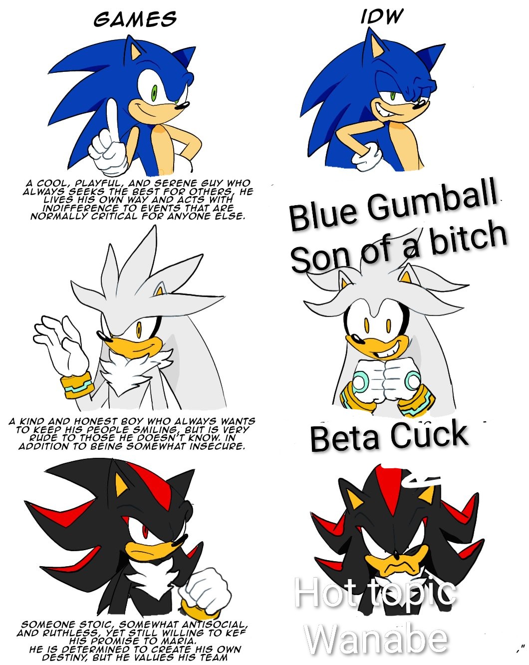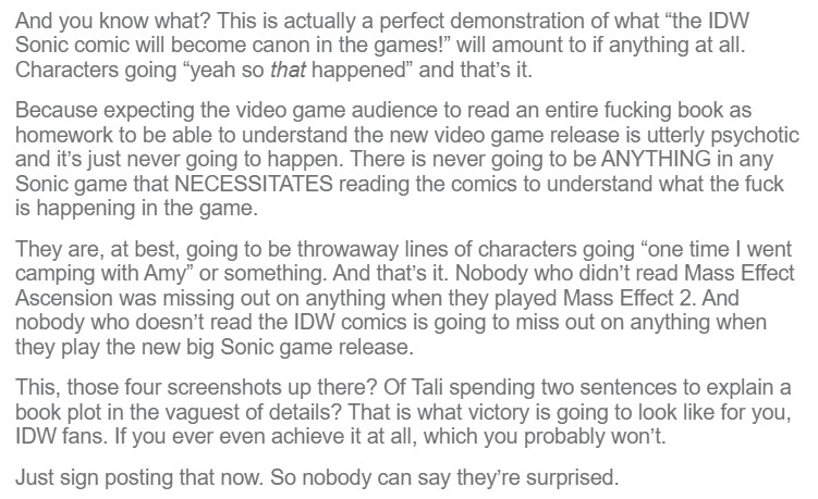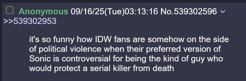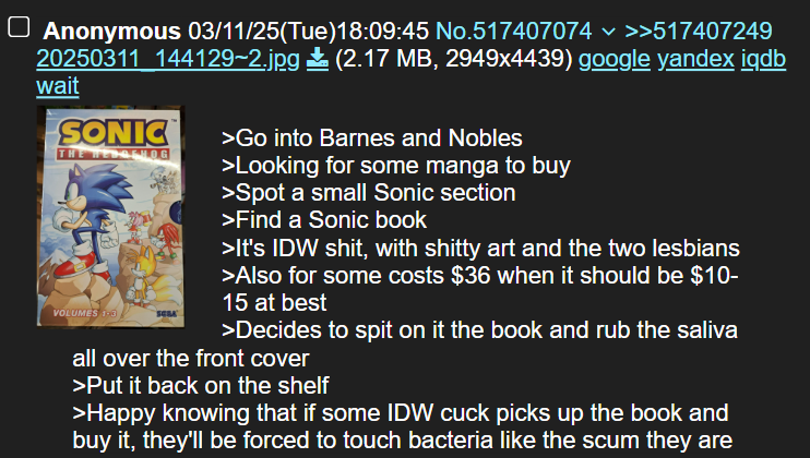 >>560233887People liked Sonic because it was a serious and gritty franchise that was still suitable for children. Why didn't Sonic Team think about keeping the audience it had built and attracting an audience of people who like that kind of tone in video games? I find it hard to look forward to anything in the future for the franchise because the games are no longer cool, we don't know if the next one will even be good, Sonic Team is creatively bankrupt and needs to rely on fatmerican movies for brand relevancy, and the IDW comics are pozzed to the core