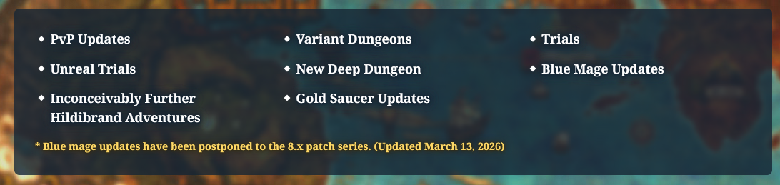 >>560218978Housing Update, new Dungeon is Garlemald, new Trial is some random from FF5, new Ultimate reveal is at Fanfest, Occult Crescent: North Horn will have new PhJobs and the second Forked Tower will have normal & extreme difficulties, new Cosmic Exploration planet etc etc Beastmaster is capped to lv50 and its exclusively solo content in its own roguelike(?) gamemode