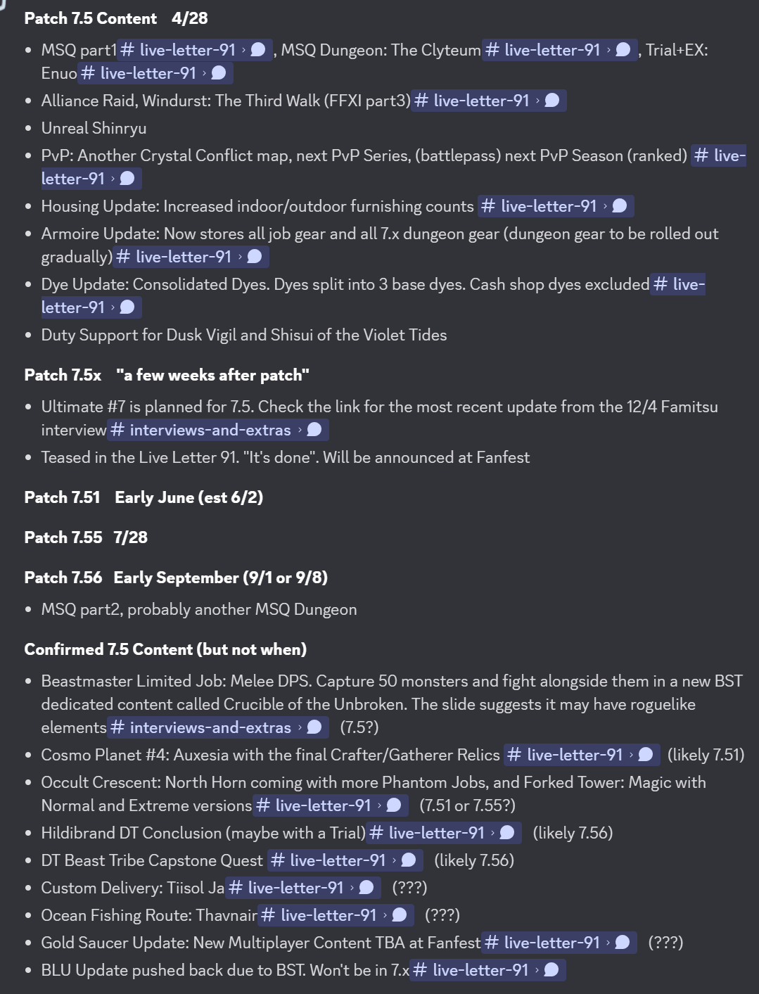 >>560218978No MSQ info.Next Alliance raid is Windurst. Unspecified Gold Saucer update.New ocean fishing site.New OC zone with level cap increase, new jobs, and the new FT has a normal mode for casuals, easier to get into.More relic weapons, more cosmic, new cosmic world is lush.Dyes are being consolidated into a few items. Glamours are being migrated more and more into the armoire.Beastmaster is coming, melee dps, 1-50, brings 3 pets, abilities change based on pets, 50 to collect from ARR zones it seems, has some kind of masked carnivale equivalent, can walk around with pet out a la carbuncle. BLU update delayed to after 8.0 due to Beastmaster.Ultimate will be announced at Fanfest next month.4/28 for 7.5