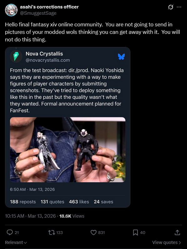 >Patch 7.45 Noteshttps://na.finalfantasyxiv.com/lodestone/topics/detail/2e8a10c44121af50ce86e1b605e10608e15f24d6>Little Ladies Day Feb 26 to March 12 (Ends tomorrow! Get your free novelty T-shirts!)https://na.finalfantasyxiv.com/lodestone/special/2026/Little_Ladies_Day/ivf88rc2gm>Resourceshttps://rentry.org/xivgresources>Meetups• March 14, 6:00 PM EDT | Malboro, Crystal Goblet W13 P26 | Art Meet >>559269538• March 15, 9:00 PM EDT | Mateus, Lavender Beds W1P16 l Albacore Plap Circle >>560072016 • March 28th | 12:00 PM EST | Balmung, The Lavender Beds, Ward 8, Plot 2 | Transformers Day of Visibility (Bayformers 1-3 maybe 1-5)Previous thread: >>560208430