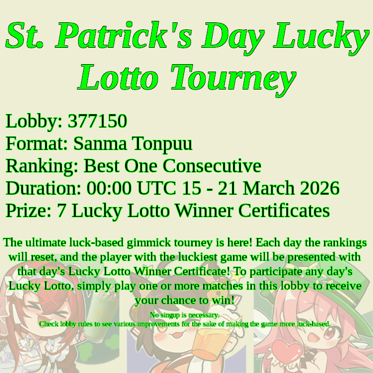 Have you ever thought, "Man, mahjong is fun, but it just isn't luck-based enough"? Announcing the St. Patrick's Day Lucky Lotto Tourney! A sanma tonpuu, best one consecutive tournament that resets every day for seven days. Each day's luckiest player will receive one Lucky Lotto Winner Certificate. All you need to do for a chance to win one of these rare and highly collectible sanma certs is to play one or more match in the tournament lobby on any day of the week.Lobby: 377150Duration: March 15 00:00 UTC to March 21 00:00 UTCNo singups necessaryAre you /mjg/'s luckiest player? Find out tomorrow!