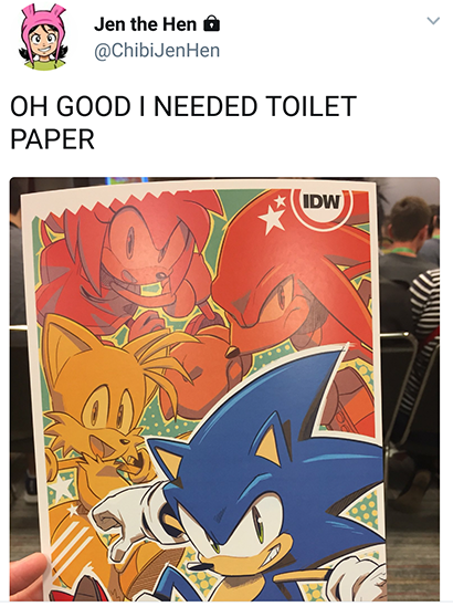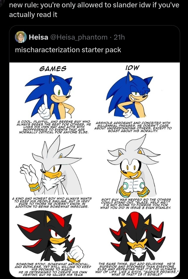 >>560244397I don't buy comics anyway and they don't sell IDW comics here eitherBut that's not an excuse for the comic writers to just write whatever the hell they want and change established characters to fit their personal headcanon version of them and don't give a shit when they are working on a official canon comic of a franchise that already has it's own established characterization and tone. Especially when the comics are meant to be canon, If the comics was their own separate thing from the games I would be less harsh