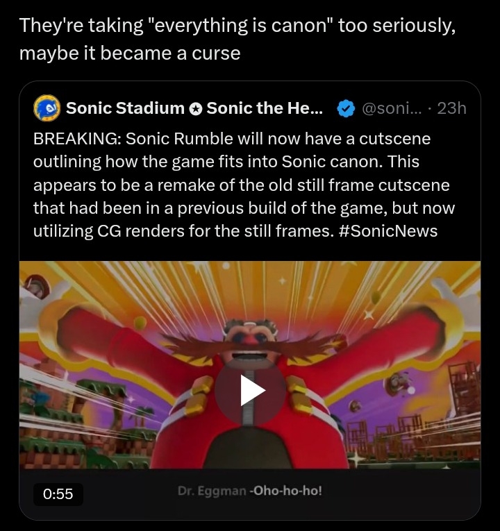 Welcome to Sonic the Hedgehog General! Here we discuss all things Sonic!/sthg/ #9154 - Out Of Context edition==NEWS==>Sonic the Hedgehog's 35th anniversaryhttps://www.sega.com/sonic-the-hedgehog?tab=35th-anniversary>Sonic the Hedgehog 4 to release on March 19, 2027https://x.com/SonicMovie==Comic Release Dates==Sonic the Hedgehog #85 - 11 March 2026Sonic the Hedgehog #86 - 08 April 2026DC x Sonic the Hedgehog: Metal Legion #1 - 06 May 2026Sonic the Hedgehog #87 - 13 May 2026Sonic the Hedgehog x Godzilla #1 - Summer 2026Sonic the Hedgehog: 35th Anniversary Special - 15 December 2026==GENERAL INTEREST LINKS==https://rentry.org/sthglinks>Milestone pastebin:https://pastebin.com/LJCfZhY4>Sonic Game/Mod Recommendation Spreadsheet:https://rentry.org/sthglinks#sonic-gamemod-recommendation-spreadsheet>Perfect System Collection:https://rentry.org/sthglinks#perfect-system-collection>Sonic comic scans:https://rentry.org/sthglinks#comics>Sonic shows:https://rentry.org/sthglinks#shows>SAGEhttps://sagexpo.org/>SHChttps://shc.zone/>#10000 Projecthttps://pastebin.com/Fb8Bt4r>/sthg/ booru:https://sthg.booru.org/>/sthg/ CyTube:https://cytube/r/sthg>/sthg/ Pixel World:https://ourworldofpixels.com/sthgPrevious thread:>>560198182