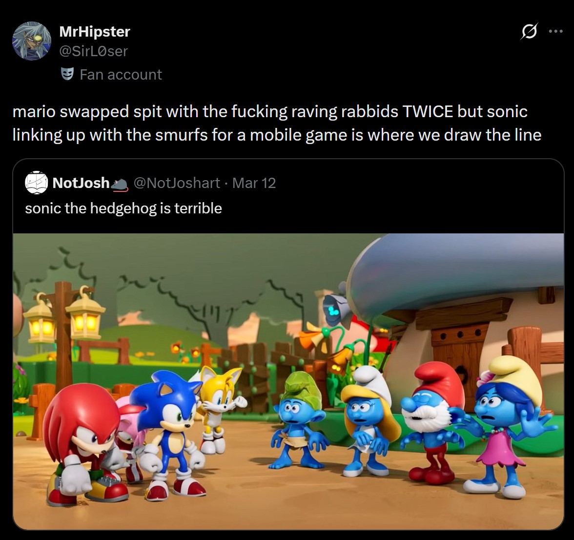 >>560246630The difference here sonicbabs, is that the rabbids crossover was actually done creatively and had an overarching plot and story and not something as shallow as a nonsensical, glorified sell-out commercial of a crossover as what sonic and the smurfs are doing where it just seems as they're just making the smurfs playable in mobile slop for no reason other than to shill them.