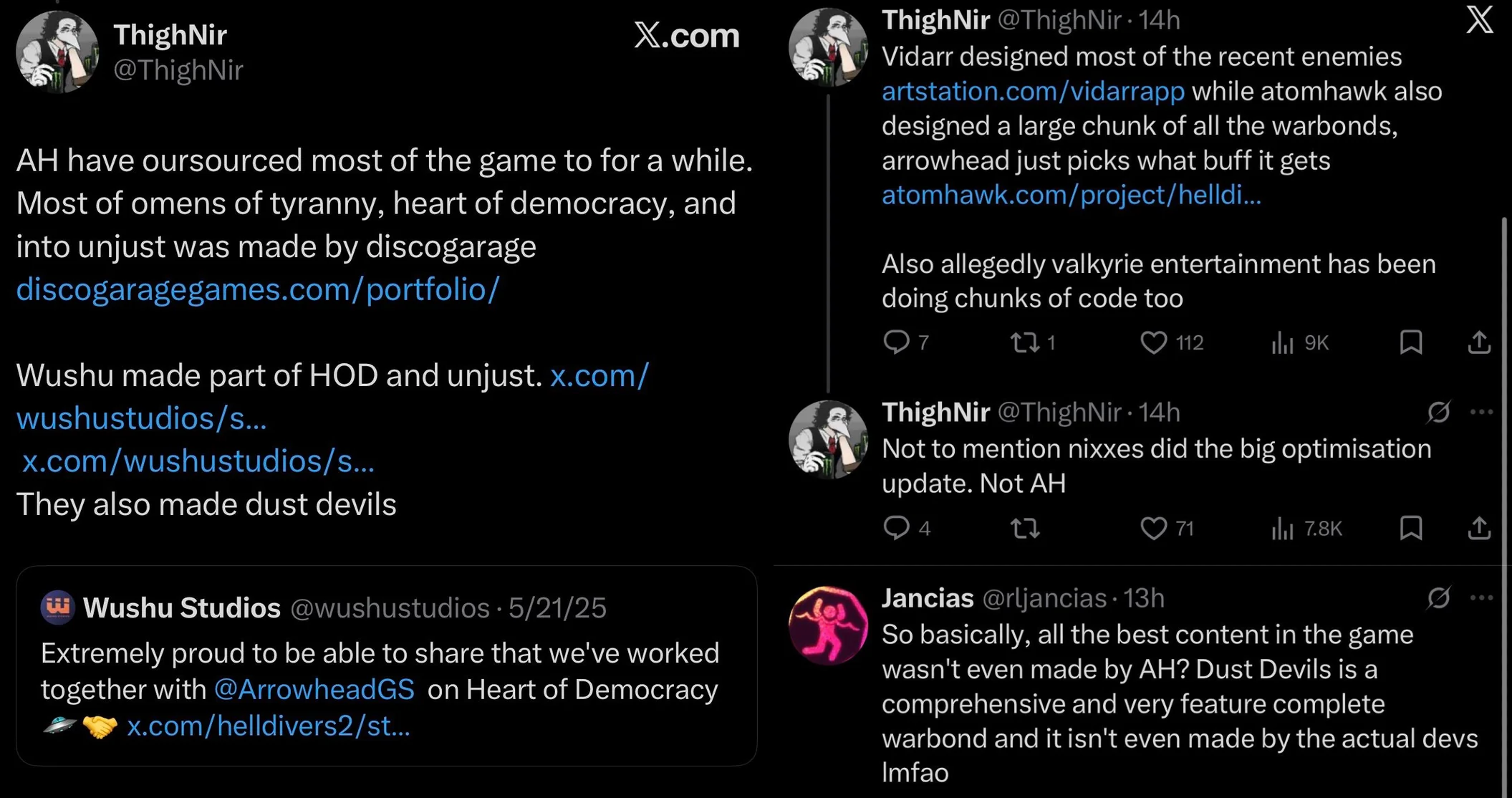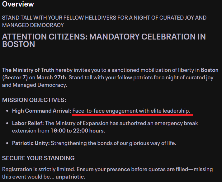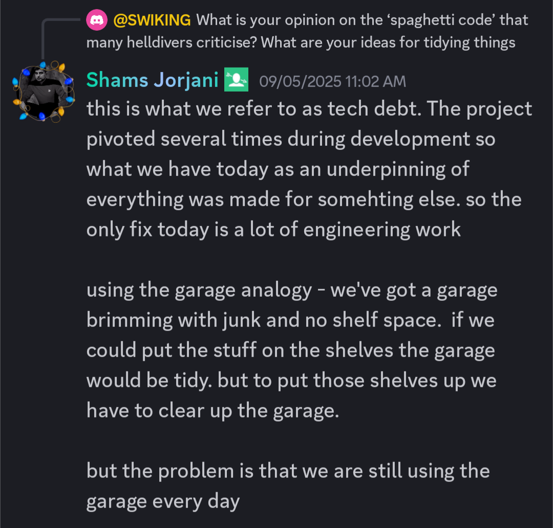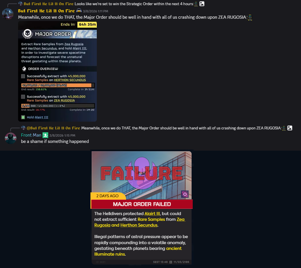 Better Thermite Edition>Previous>>560189683>WHAT IS HELLDIVERS 2?HELLDIVERS 2 is a 2024 crossplay, co-op, squad-based, PvE 3rd person shooter for PC, PS5 and XBox Series X/S where players fight against hordes of alien insects, robots and squids to Spread Democracy™. Players wage war on contested planets, each with a different biome, completing as many objectives as possible in a procedurally generated level while constrained by a time limit. With enough successful missions, a planet can be defended or liberated, and the player base must combine their efforts as much as possible to Liberate™ the galaxy.https://store.steampowered.com/app/553850/HELLDIVERS_2/https://www.playstation.com/en-us/games/helldivers-2/https://www.xbox.com/en-us/games/store/helldivers-2/9mx9wn9dfpgt>WHAT ABOUT THE FIRST HELLDIVERS GAME?Released in 2015 for PC, PS3/4 and PS Vita, the original HELLDIVERS is a shared screen top-down shooter in the same setting. Its mechanics were based primarily on Arrowhead's first game, Magicka.https://store.steampowered.com/app/394510/HELLDIVERS_Dive_Harder_Edition/https://www.playstation.com/en-us/games/helldivers/>LOBBY HOSTINGhttps://files.catbox.moe/83ixkr.png>MODDINGhttps://files.catbox.moe/c81ogo.png>INFORMATION RESOURCEShttps://helldivers.wiki.gg/https://helldiverscompanion.com/https://democracy-hub.nethttps://helldive.live>MAJOR NEWSJan 22 Redacted Regiment https://www.youtube.com/watch?v=AtvwvsJRSKkFeb 03 Siege Breakers https://www.youtube.com/watch?v=u9E9-iGwK_4Feb 04 A Bastion of Freedom https://www.youtube.com/watch?v=B8ZhrAP7k6YFeb 10 Machinery of Oppression https://www.youtube.com/watch?v=gj5JS68ny14Mar 17 Entrenched Division https://www.youtube.com/watch?v=k3zP5GWoQi0>LATEST PATCHESFeb 03 1.006.001 https://store.steampowered.com/news/app/553850/view/506226349467240138Feb 10 1.006.003 https://store.steampowered.com/news/app/553850/view/541129880857741482
