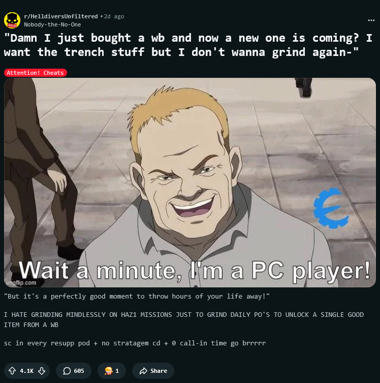 >>560256380why don't they just make SC into a mission reward?>get base amount of SC for completing a mission>random % chance to get further SC that increases for every objective you complete>also increases based on difficultyI mean I feel like a lot of these issues are completely solved in other games alreadyand before you say anything be reminded that the current system of grinding SC is to endlessly grind trivial missions and disconnect as soon as you get your cachethere is no endgame progression currentlyWHY NOT TIE SC GRINDING TO THE ACTUAL GAME