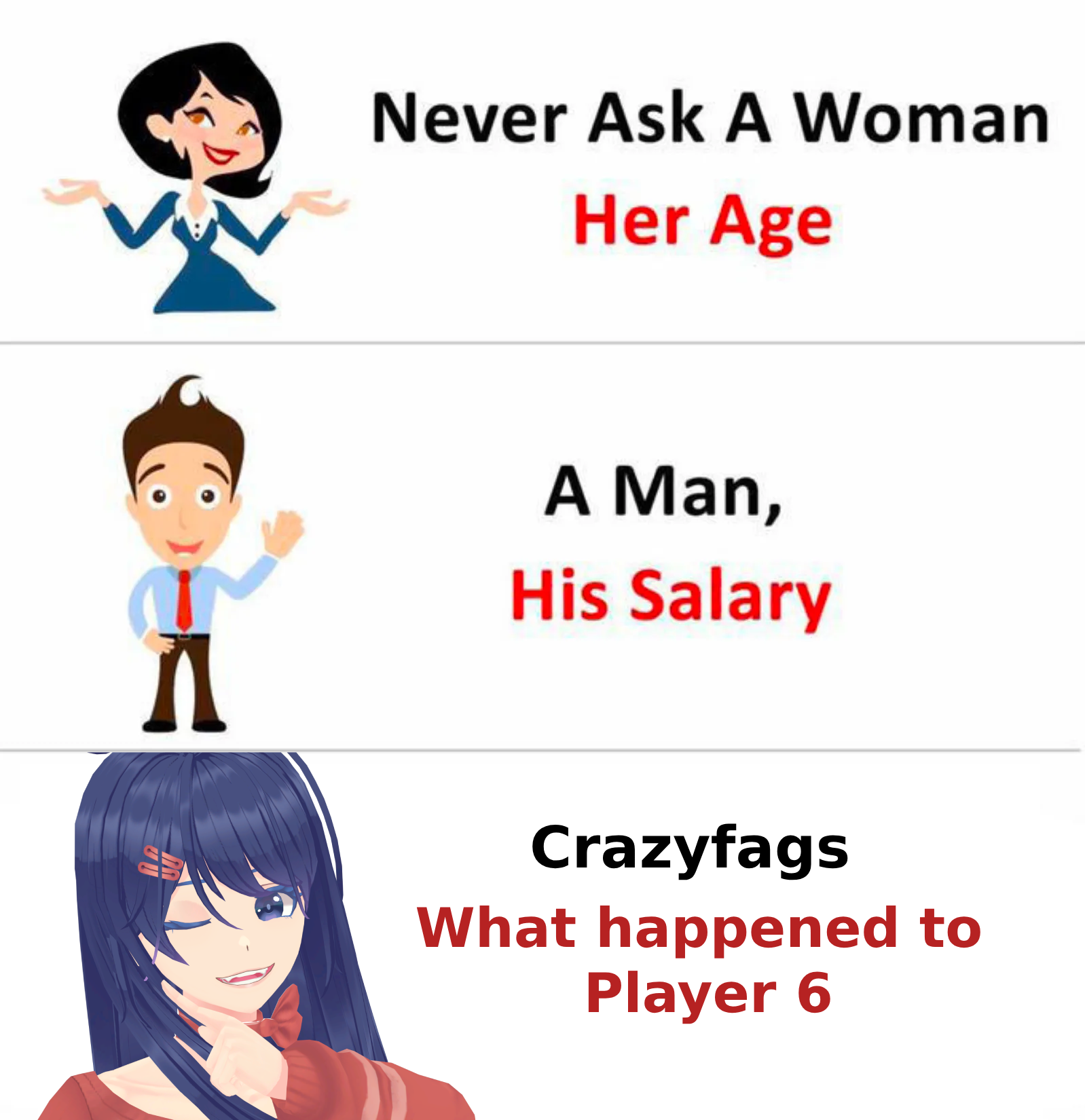 >>561977187A common theory is that Player 6 was so subservient to Crazy that he just BORED her to death. So she made a copy of him because why not at that point and then kicked his ass out the game. Source: Me.