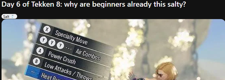 >>560364318the guy who won is a known ed player, just because you don't know him it doesn't mean he's some random guy who played the game for the first time.he's skilled and he won, it's that simple, i know it sounds strange that people can actually win in sf6 cause we are so mentally stuck to the same 8 people for 15 years in tekken that it feels surreal.tekken 8 is arguably even more coinflips than sf6 due to the sheer amount of things an opponent can throw at you.TLDR: playing sf6 gives you a chance to take your hobby to the next level, instead of getting stuck in a cycle of hate