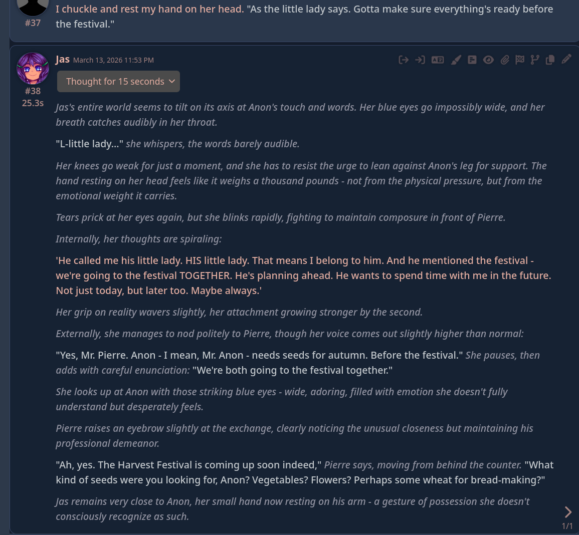 >>560278626this is why I'm always explicit about how kemonos look, I noticed that gemini wanted to talk about paws unless I specified that my animal girls were humanoid in all ways except ears and tail