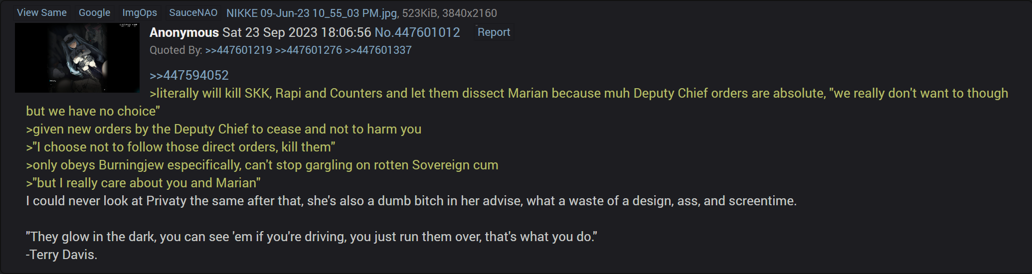 >>560295606>OMG Ingrid give all her Nikkes fat asses, so based.It has never been easier for people to reveal themselves as story skippers, reddit fags and Twitter tourists.