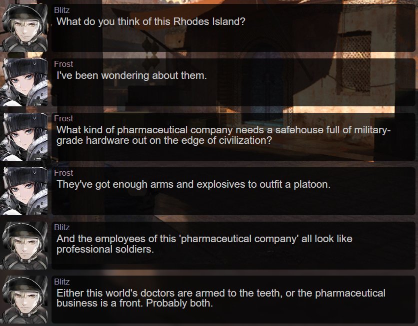 >>560339630I can't remember if there was anything on screen with Ursus and it's been like, literally six years since I read this stuff, but there was definitely deals going on with Wei (leader of Lungmen). Can't remember if that deal stayed intact though.Later there will be more big deals going on like in Kazimierz and whatnot, although I can't remember how much of that was event specific side mechanics?Generally governments view Rhodes showing up as a positive for stability and Rhodes has branch offices all over the place, a bunch of side stories and records involve them, and there's partnerships with non-government entities like Blacksteel whose heads form partnerships with Rhodes out of at minimum a desire for a solution to the tension caused by (them) mistreating infected while also lacking the capacity to really actually help them (and not-helping them too hard makes them a danger to everyone, so more discrimination)