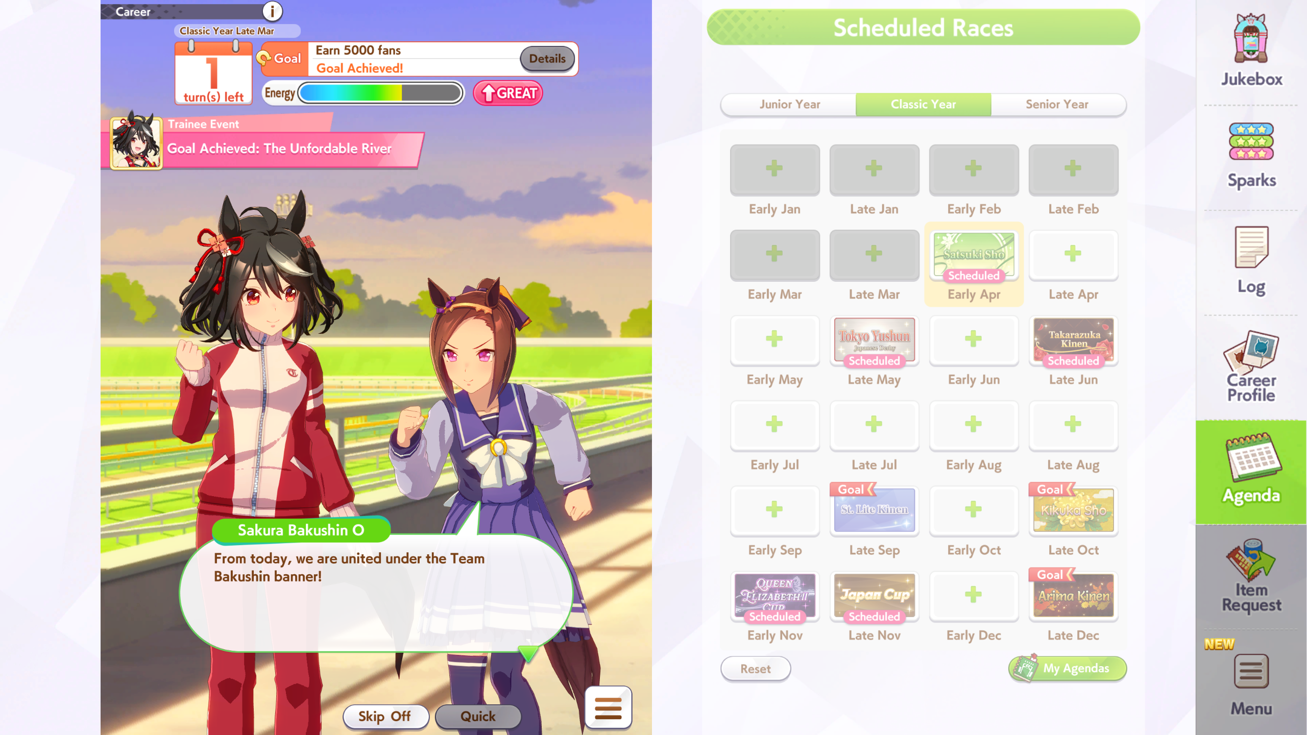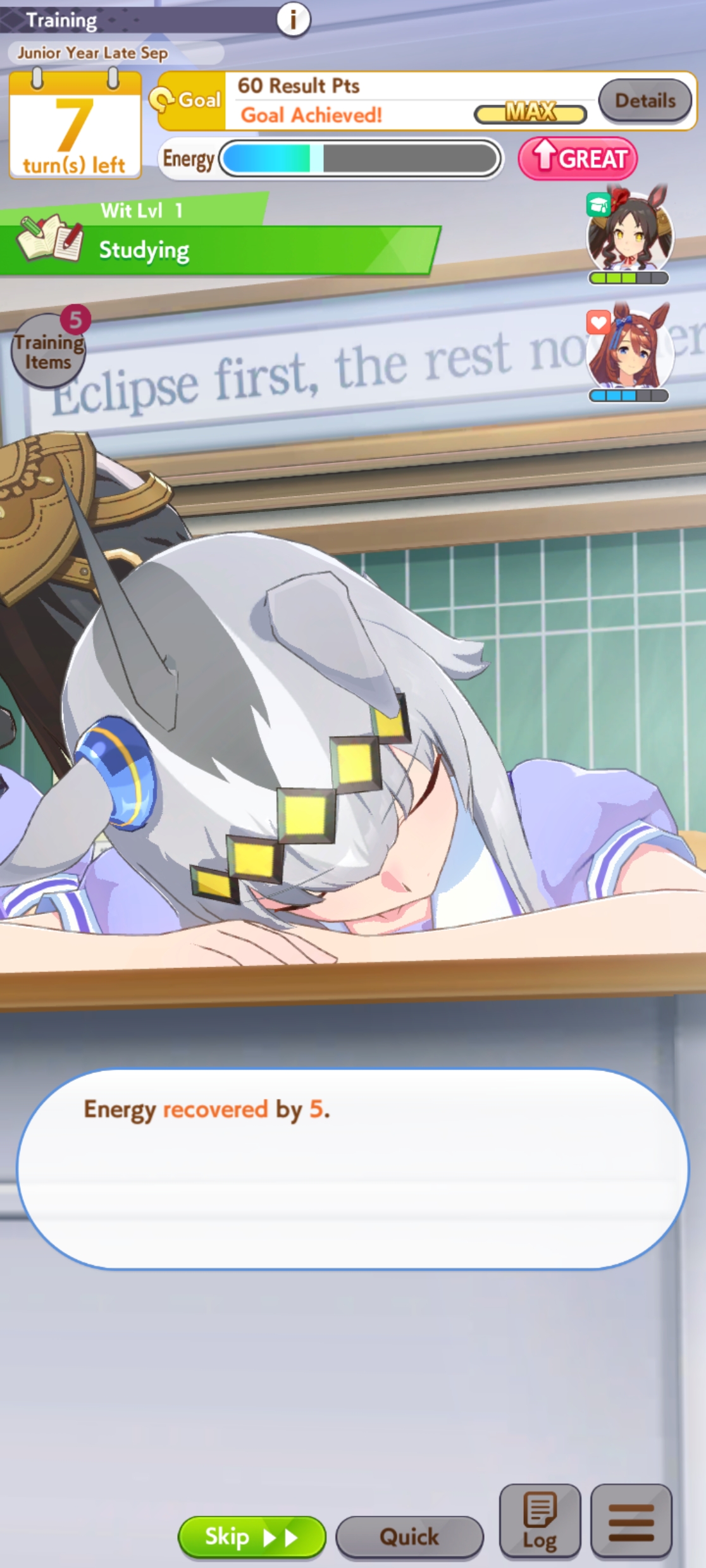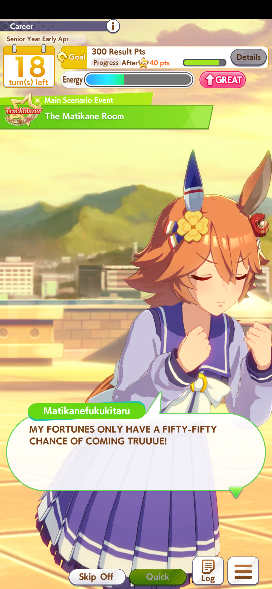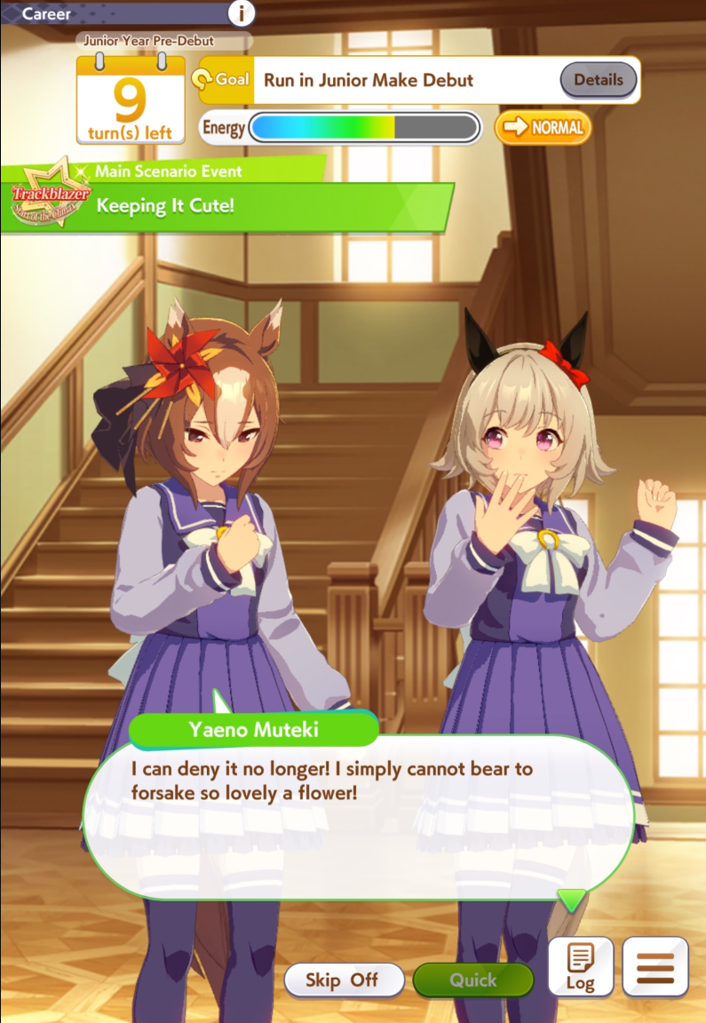 >>560312132Classic Yasuda risks 3 races in a row for no real reason, afaik any eptheths you can get from senior Yasuda. You want to prep energy for summer anyway unless you've highrolled energy items.