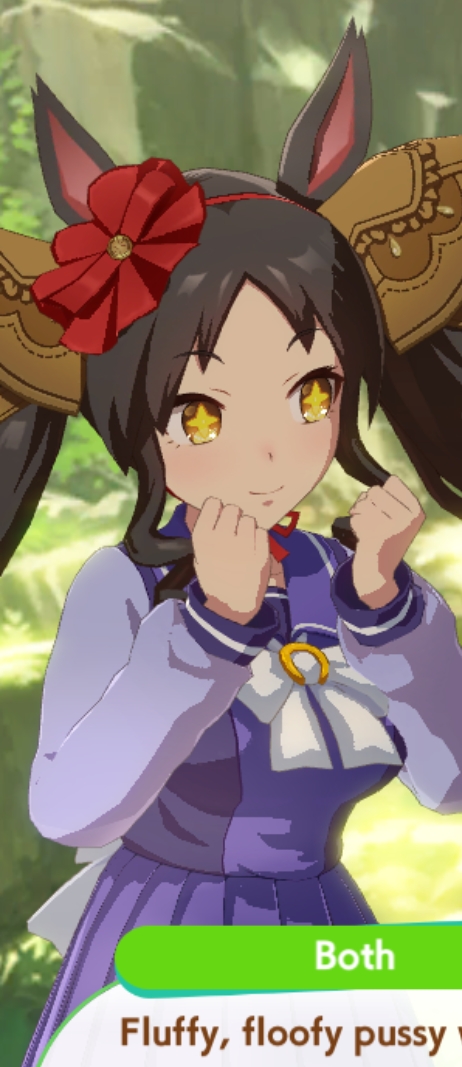 >be a beta, shy, clumsy trainer with short stature>hear about Super Creek and be curious about her, hoping she'll free to train and chooses you>you hear footsteps behind you>you feel an hand on your shoulder and a powerful presence behind you, a huge shadow covers you>you slowly turn with a nervous smile, your heartbeat accelerates and you blush>"that's it, she got me! I'm gonna be Super Creek trainer!">what you have in front of you is a slimmer figure then you'd expect, her boobs in front of you>she picks your chin and pulls up>you see a wicked but beautiful smile>that's not Super Creek... that's Sirius Symboli