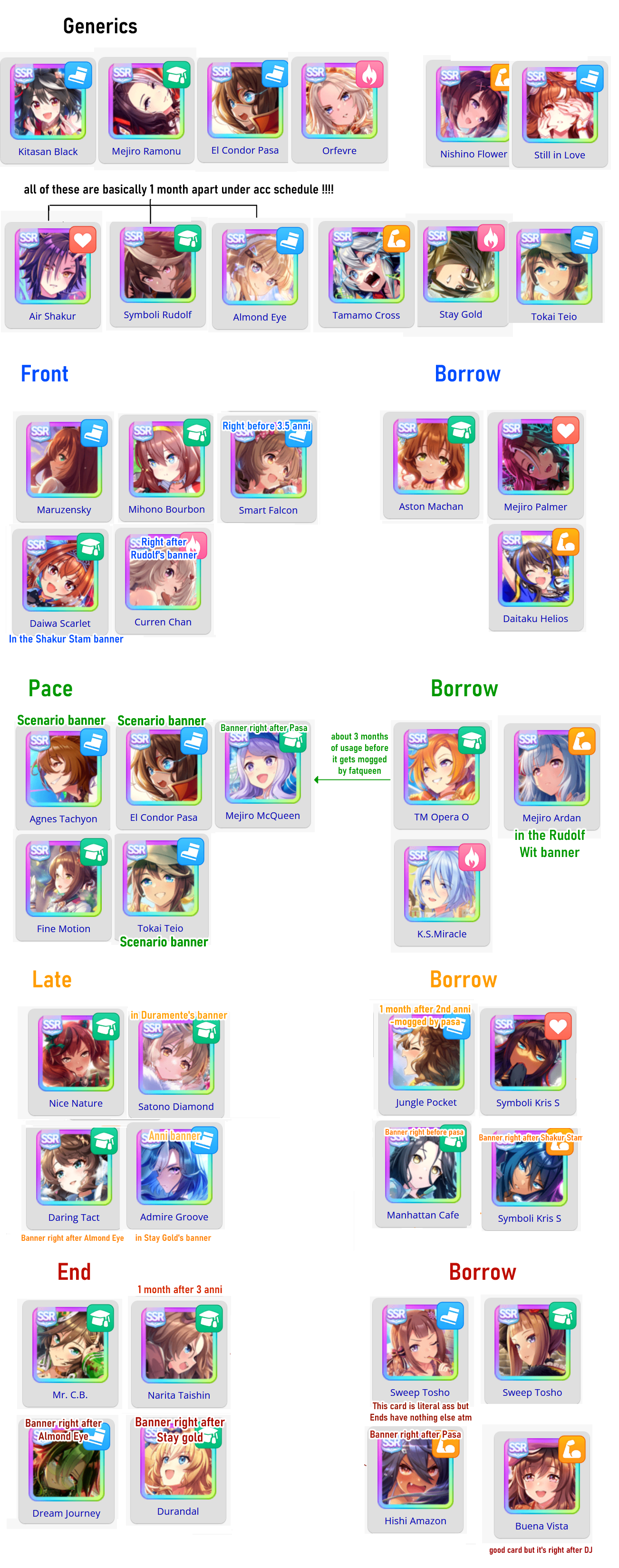 Previous: >>560299794>Global Game NewsLink your account to Cygames iDCurrent Scenario: Make A New Track aka "Trackblazer"Current Rate Up Trainee: Kitasan Black (3*), Matikanetannhauser (2*)Current Rate Up Support Cards: SSR Narita Top Road (Speed), SR Admire Vega (Guts), SR Mejiro Ryan (Stamina), SR Bakushin (Power)Current CM: Pisces Cup - Hanshin Turf 3200m03/02 - 04/14 - Halved TP Cost & 2x Career Mode Rewards03/02 - First Anniversary Part 103/05 - Admire Vega (3*), Kawakami Princess (SSR), Fine Motion (SSR)03/12 - First Anniversary Part 203/12 - 03/24 - Free Daily 10-Scouthttps://umamusume.com/news/632/03/12 - Kitasan Black (3*), Matikanetannhauser (2*), Narita Top Road (SSR)03/12 - Flying Run-Up! Story Event03/12 - Trackblazer Release date03/22 - Satono Diamond (3*), Curren Chan (SSR), Marvelous Sunday (SSR)03/23 - First Anniversary Part 403/23 - Agnes Tachyon, Narita Taishin, Narita Brian legends races03/26 - First Anniversary Part 403/26 - Mejiro Bright (3*), Curren Chan (SSR), Zenno Rob Roy (SSR)03/26 - 04/05 - Pisces Cup - Long/Right/Spring/Heavy/3200https://pages.snep.pw/uma/anni-skill-changes/>JP Game NewsCurrent Rate Up: Loves Only You (3* alt), SSR Marche LorraineNew Scenario "Beyond Dreams" releasedTimeline: https://uma.moe/timelineCygames Webstore: https://webstore.cygames.com/en/umamusume_en/>Thread Clubshttps://rentry.co/umaglobalclublistYou must be E3 (20k points) to join a circle. Apply with /uma/ or /vg/ in your profile or post ID in the thread.>All Guides & Resourceshttps://rentry.org/uma26Game databasehttps://gametora.com/umamusume (Click the gear to switch between JP / global server info)A basic guide for newfagshttps://rentry.org/umaglobalFind networks if your region is blocked from the game or clienthttps://www.umavpn.top/Seiyuu & Concertshttps://rentry.org/umstUmamusume Birthday Calendarhttps://ウマ娘.攻略.tools/events/birthdayUma Texthttps://umareader.idsmile.xyz/