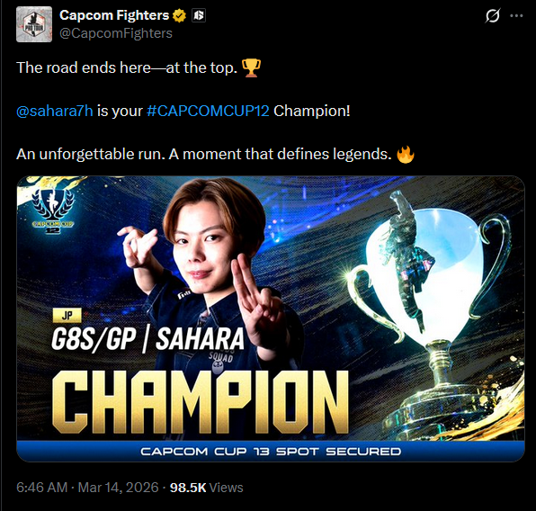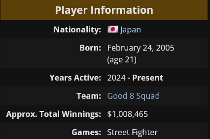 Sahara: - Picked up fighting games with the release of SF6 (former FPS pro).- Started entering tournaments in 2024.- Got signed by G8S in 2025.- Capcom Cup champion in his first full season as a professional player.