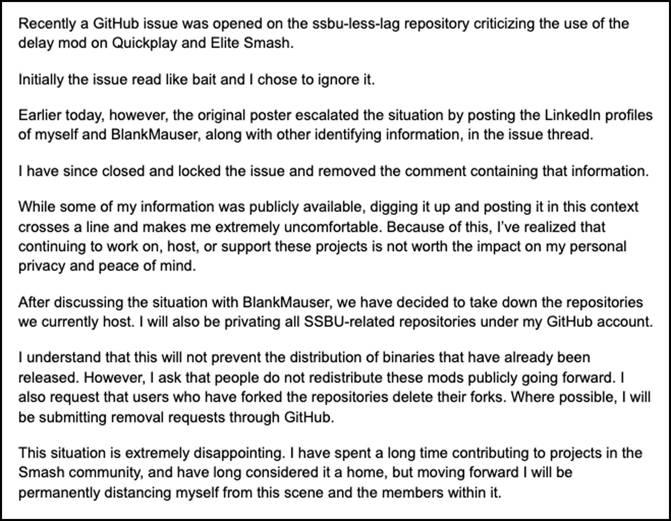 >>560368680Let me see if I understand this situation correctly. Smash is a delay netcode game with high input lag even offline. On a platform where most people use wifi. Meaning the game is completely unplayable online, any fighting game in those circumstances would be clowned on and would be dead. Someone made a mod that makes the situation a little better. Instead of hailing the guy as a hero, the Smash community said they actually WANT to have dogshit netcode and doxxed the guy. When a similar thing happened to SFV we did hail the guy as a hero but it was Capcom itself taking down the mod, here the bootlickers are protecting poor Nintendo for free! I swear I don't get Smash fans