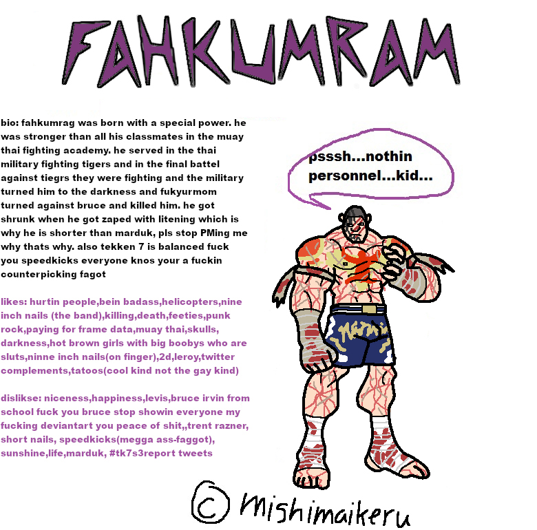 There is literally nothing more insane to me that Fahkumram players believing they're playing a weak character holy shitHe just presses 3 from range 5 and you're in a 3 way mixupLiterally worthless to even bother stepping this character because his lows are homing. ACTUAL HOMING i14 LOW THAT COUNTERHITS FOR 41 DMG AND DOES 18 ON NORMAL HIT. Oh and you stepped left and he pressed the funny bf input? Here's a 100 damage launch, +6 oB mid tracks weakside btw.Jesus fucking christ. Good thing he isn't that popular becuase he looks like actual fucking trash in movement and his design looks like it was made by a retarded teenager who got bullied.