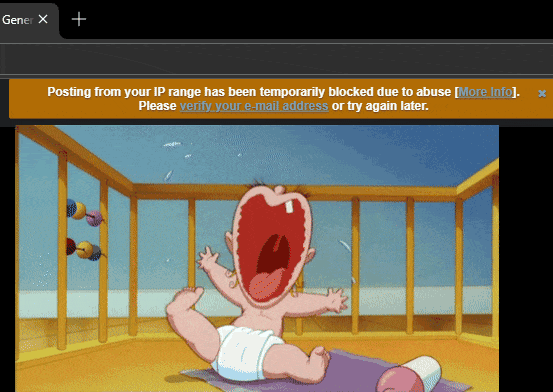 >>560486116day 6 of "temporarily" blocking my IP rangemaybe the inhabitants of crack shack(house) down the street are spamming 4chan