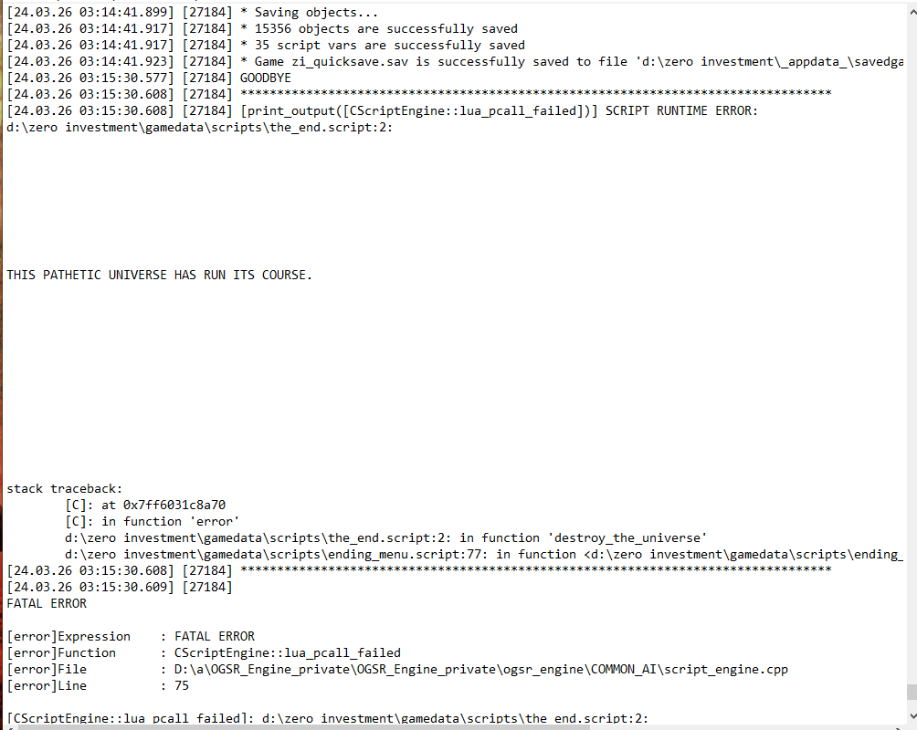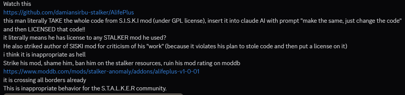 ALifePlus developer on SISKI:>"pcall on anything including luabind is obvious LLM. just compare with Demonized/RavenAscendant mods. errors and dead code inside loops, missing basic linting, violating fundamental coding principles and hundreds of lines of dead code in hot paths - is not the code of someone that designs budget based backpressure limiters. copy pasted code from other mods - including comments - with layers over layers of ai slop is obvious LLM. the subject is not whether some guy used LLM on some mod, but that that guy and his buddies follow my mod around and keep talking about their mod, while making false accusations about mine.">"it's obvious from the code itself, even with Ai it's not even linted and fails basic programming fundamentals.">"After seeing that garbage code, the author admitting he knows no programming and how dumb his agitators are, I am ok really.">Btw: everybody in the industry uses 'AI', some companies literally enforce it, but not for doing architecture or writing code. But for validation, harness programming, standardization. Uniform code and luadoc in a library is not a sign of AI, but a sign of common sense engineering.