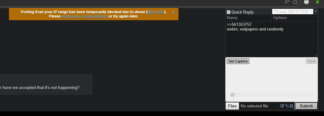 well that interestinglots of "operatives" floating around, need to be culled.>>560594094I second this.but its annoying as shit because whats the fucking point of individual IP bans then.my ISP has dynamic IP's but its not like it changes often and I dont use a vpn.I swear its just them being lazy or something.