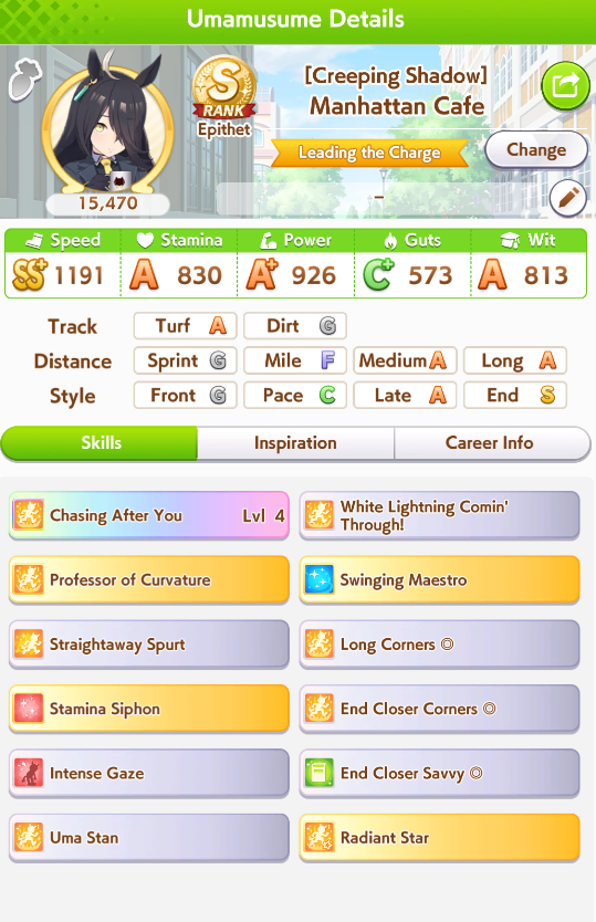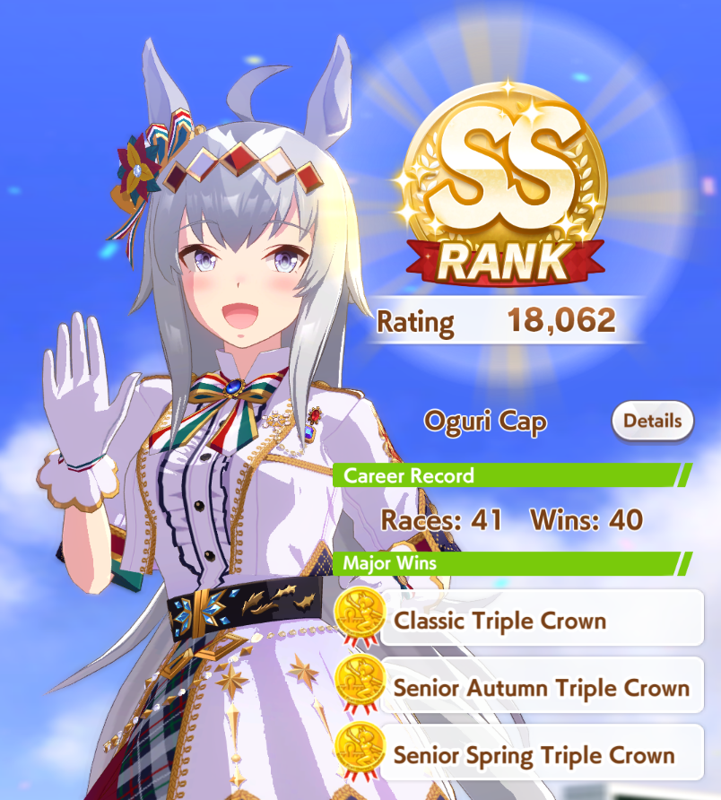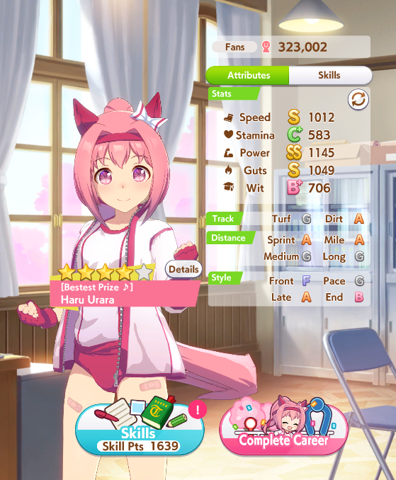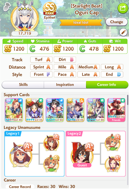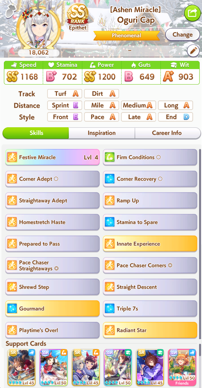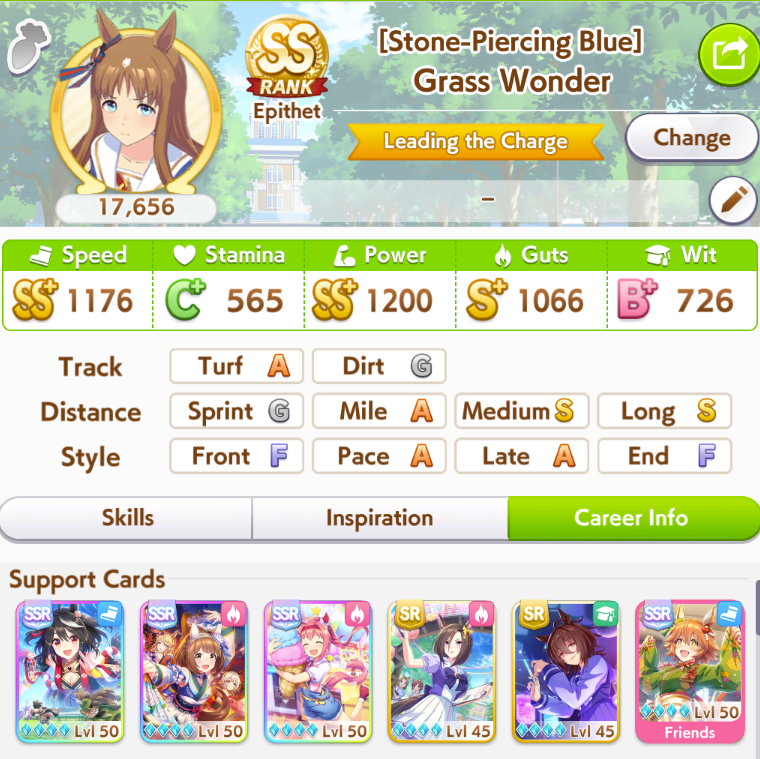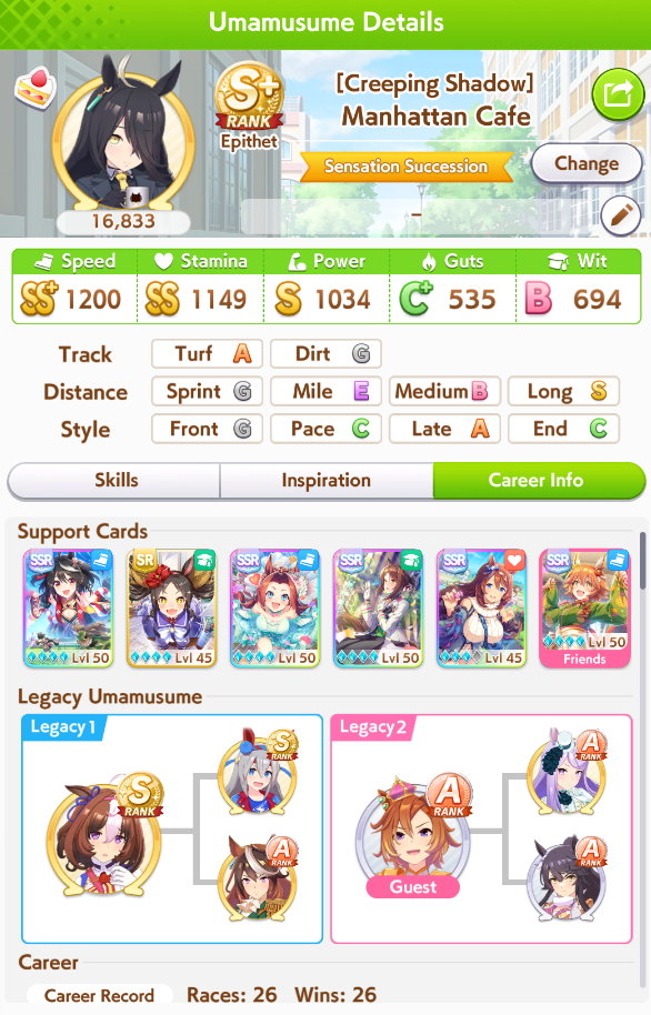 >spent all my clocks on takarazuka fucking kinen>still lose a few more g1s in senior year>speed and power not capped>awful run overall>S+ rank.I swear to god I had Unity careers where the whole runs felt like highrolls infused with dopamine and then end up with a subpar 12k A+ rank, it's incredible how MANT is the inverse of that if you know how to play its ball.deck was SSRs urara and yukino guts, SR groove guts, SRs marvey and tachyon wit, SSR fuku speed (borrow). all mlb