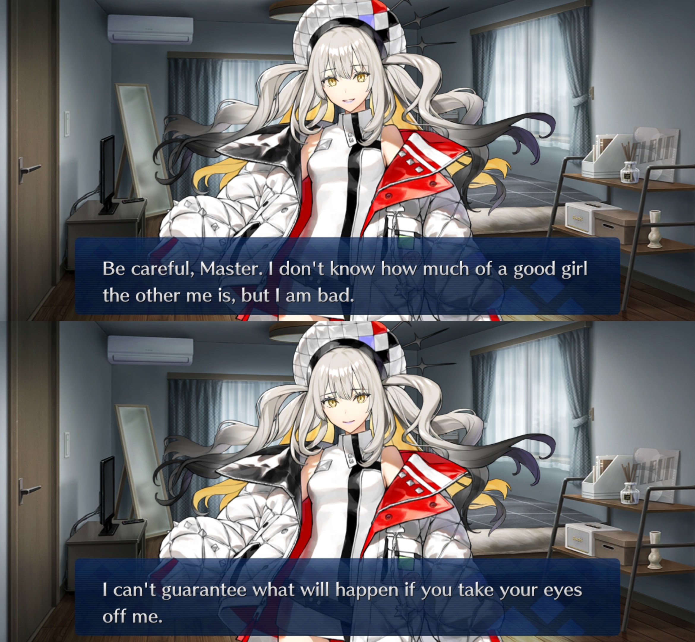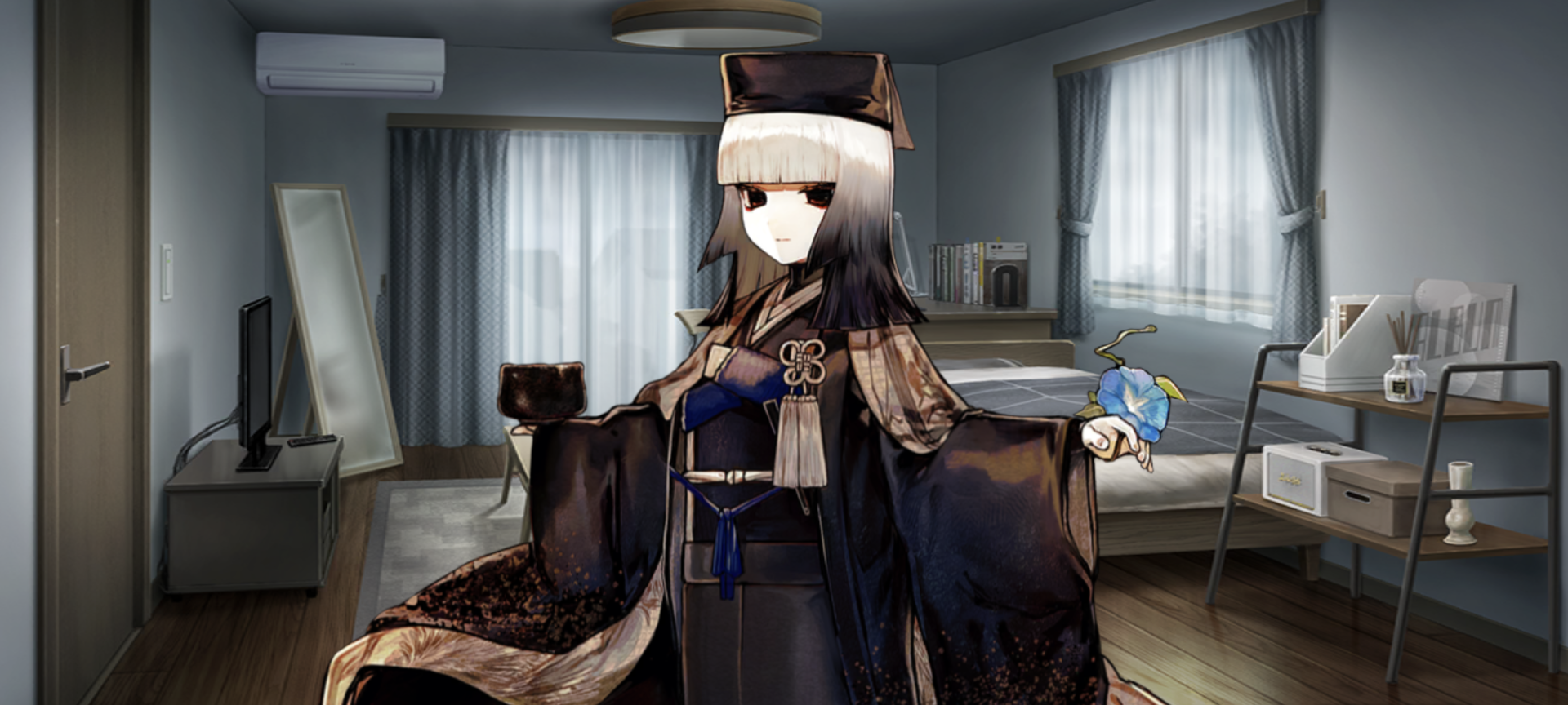 Rikyu-san in this room makes me want to sleep with her on a screen by my bed again. I've been doing it more recently. She helps me sleep. The thought of her staring at me in a dark room as a sleep is calming. I've added ambient horror audio before to it too.