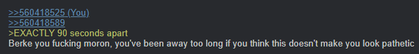 >>560418525>>560418589>EXACTLY 90 seconds apartBerke you fucking moron, you've been away too long if you think this doesn't make you look pathetic