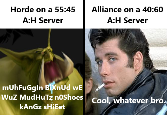 >>560859704my experience with Horde was that everyone was trying to be the most l33t gamer/bankstander, it was very rare that you had a fun time. I'm not saying it's impossible, but it was rare. You don't really get close to that very specific kind of no-fun that you do with belf paladins or female orcs on the Alliance.Maybe female nelves, maybe some gnomes, but it's generally a lot more fun.