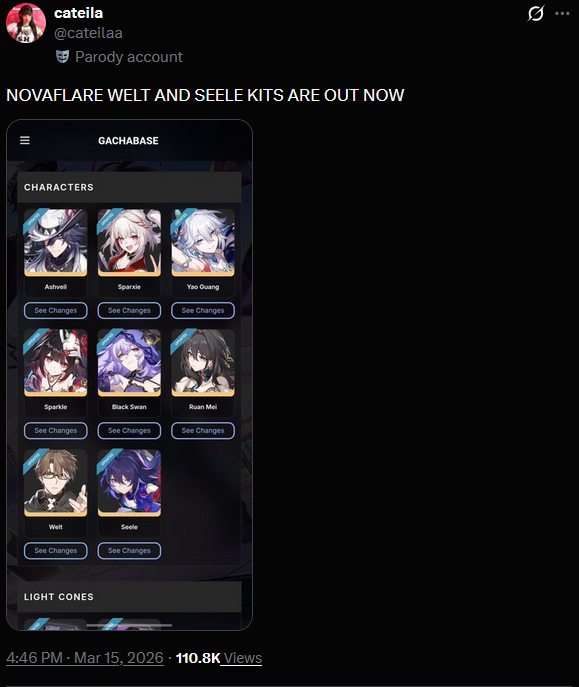 Previous: >>560438707>Version 4.1 "Unraveled for Daybreak" Special Programhttps://www.youtube.com/watch?v=TgGPAPo02pMhttps://www.youtube.com/watch?v=H97-304rAxs>Download - https://hsr.hoyoverse.com/en-us/home>4.1 Preview Page - https://act.hoyoverse.com/puzzle/hkrpg/e20260313version_1365/index.html>Version 4.1 Trailer: "Unraveled for Daybreak"https://www.youtube.com/watch?v=HqQqHgt4frUhttps://www.youtube.com/watch?v=LMt1zaLUa08>Sparxie Character Trailer: "Ravings"https://www.youtube.com/watch?v=NU6J88t4luMhttps://www.youtube.com/watch?v=AdUoc-nSB94>I'll Never Forgive Star Railhttps://www.youtube.com/watch?v=7ia3b_9-znQhttps://www.youtube.com/watch?v=gI-W8r-TWUM>Current Character Banners: Sparxie, Yao Guang, Cerydra, Rappa, Sparkle + Pela, Hanya, Qingque - https://www.hoyolab.com/article/44017918>New Drip Marketing:>Silver Wolf LV.999 (5* Imaginary Elation) - https://www.hoyolab.com/article/44129793>Evanescia (5* Physical Elation) - https://www.hoyolab.com/article/44140823>Elation Trailblazer (5* Lightning Elation) - https://www.hoyolab.com/article/44152517>Redeemable Codes - https://hsr.hoyoverse.com/gift4T28RJM4MS3BSub2SparxieMH5KCBGF3AAT45QSTARRAILGIFT>/hsrg/ Tools & Resourceshttps://rentry.org/hsrg-resources-14>/hsrg/ Thread Templatehttps://rentry.org/hsrg-thread-template-14