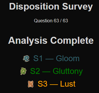 Finally got around to itDang I was expecting some sloth in there. The wrath and gloom are expected.