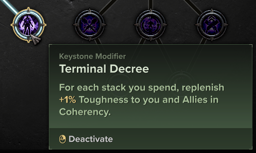 >>560622932>Terminal Decree>For each stack you spend, replenish 1% Toughness to you and Allies in Coherency.>this means you can make a single attack with high cleave, generate 6 stacks or so, QQ swap to secondary and back to primary, and constantly generate absurd amounts of toughness for everyone>the class' best ranged weapon has so much cleave and hits so many targets, you hit 20 stacks in 2 shotsWell god damn, I might give up my wallhack for this, even if taking it means being taxed for a useless dogshit pathing node.