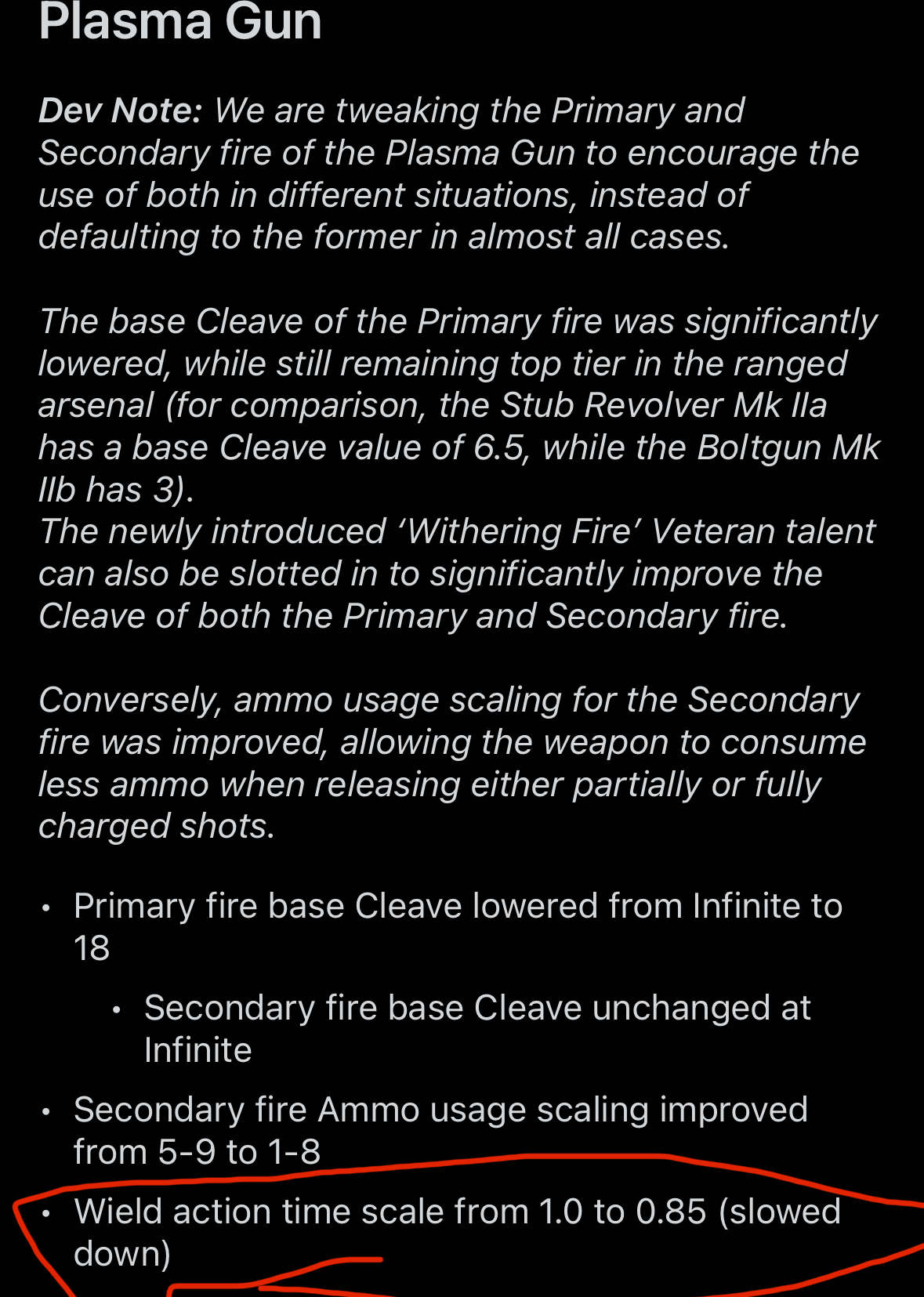 >>560459648They're buffing all these weps. Plasma is getting more of a rebalance but it's getting more ammo efficient at the cost of forcing you to charge up if you want infinite cleave