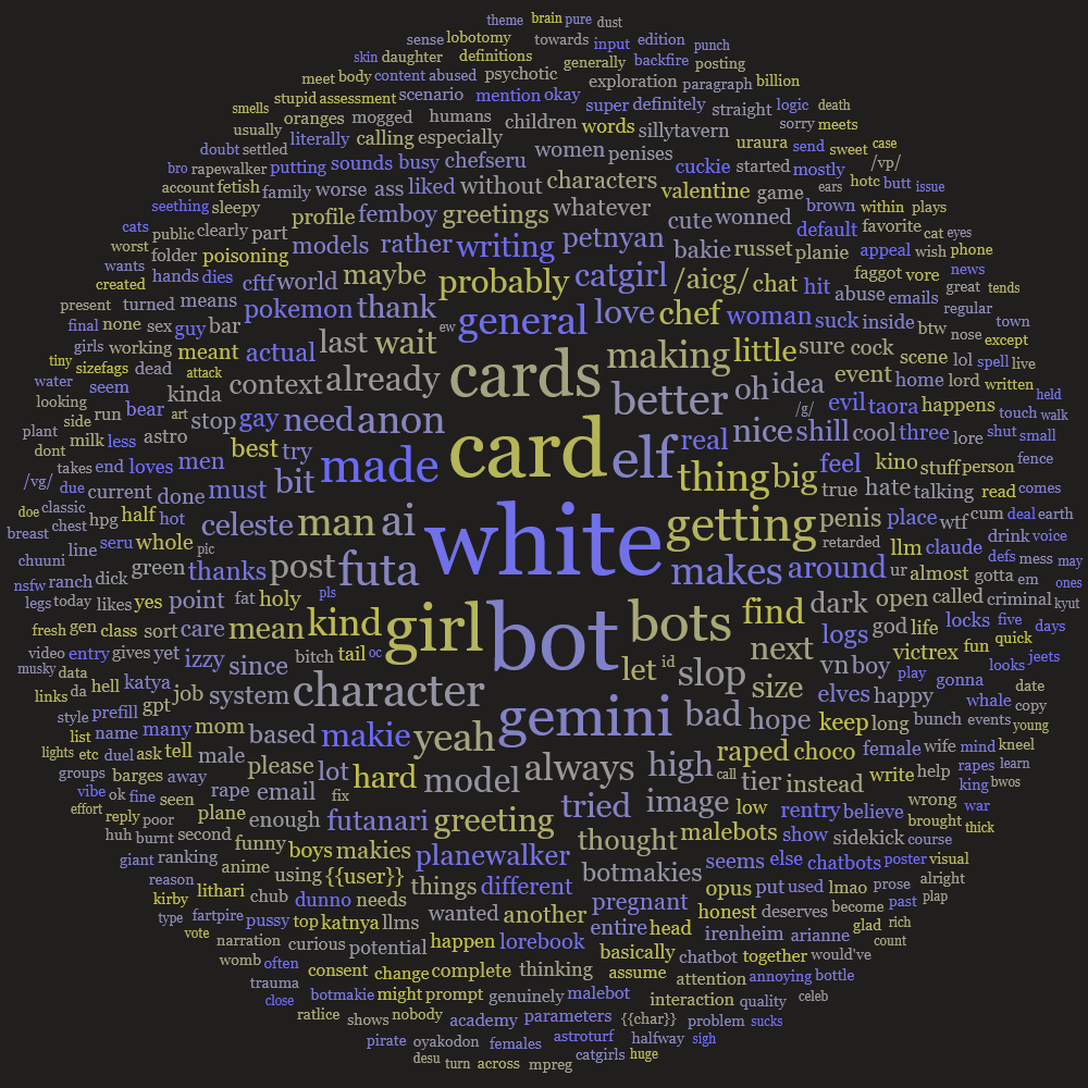 >>560503041It's fucked up, man. Interesting/unique metaphors are one thing, but it's like it took "out-there metaphors are good no matter what!" from it and is perfectly content to mash two things together that might individually describe something well, ie. her stomach was loud (foghorn) and the rumble was wet (soup), but together and in context, they make no fucking sense. What stomach sounds like a foghorn? What does a foghorn made of soup sound like? Can it even make a sound? Totally collapses as imagery and makes me more aware that I'm just talking to a token predicter than any other -ism ever has. Just insufferable.