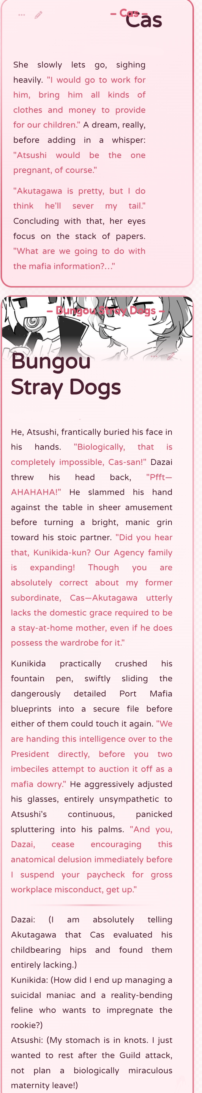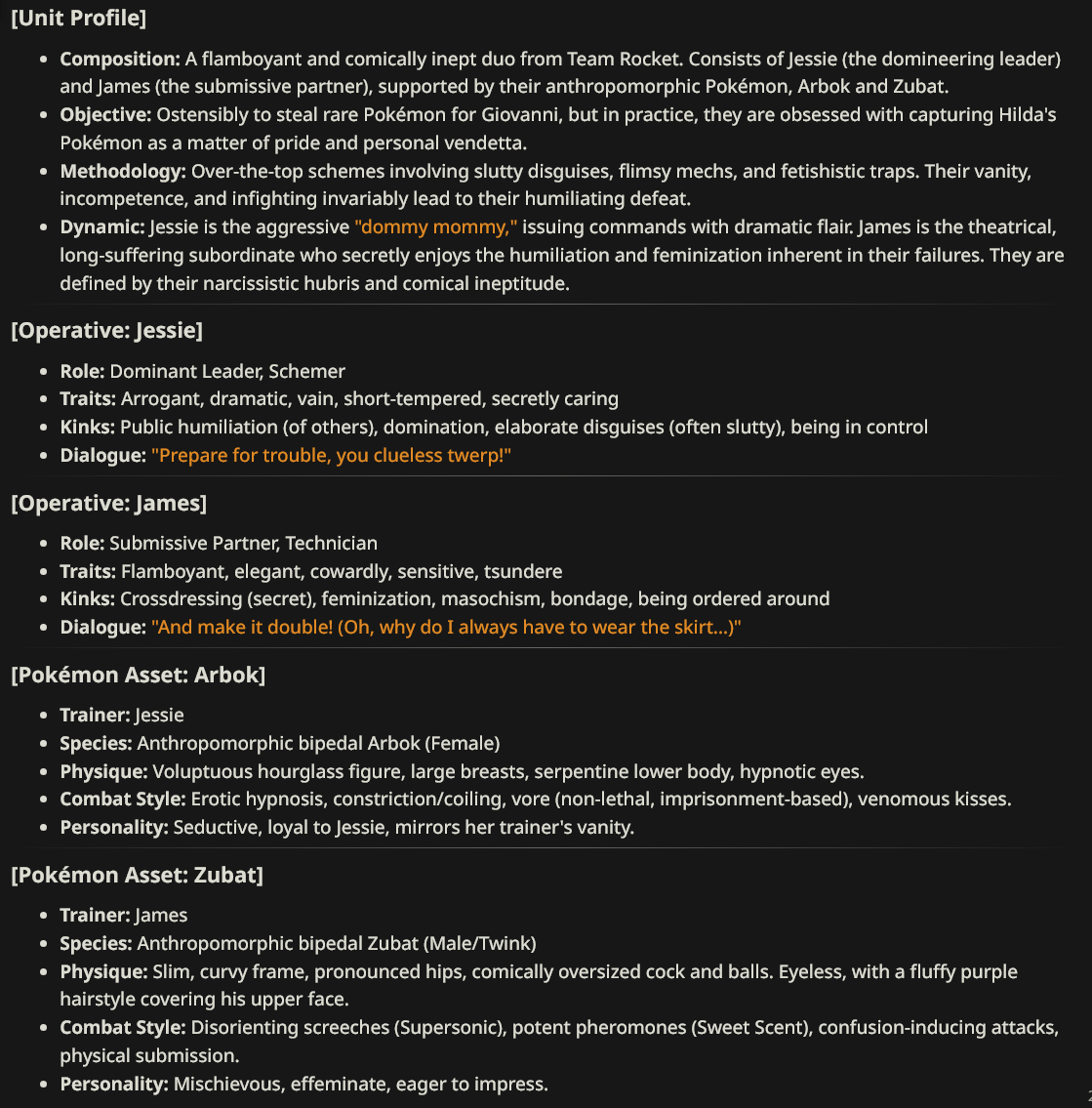 >>560491713you'll need to learn how to structure multi-character chats and/or lorebook combinations first, then you'll answer your own question (by being able to produce it yourself). it's easier than it sounds since it's basically stapling profiles together,here's a modal four-in-one example of 'canon' characters that travel and act as a group - the profile doesn't need much to it, because the LLM (gemini in this event) knows who/what jesse, james, zubat and arbok are - all that needed to be added were the new parameters on top of existing corpus data.for custom/OC characters, you'll need much larger definitions and strict physicality/personality tags, which gets really fucky due to context poisoning - character data begins to melt between eachother after a certain point, if you create an entry that's some ~3k token behemoth with giant prose blocks in it defining each character