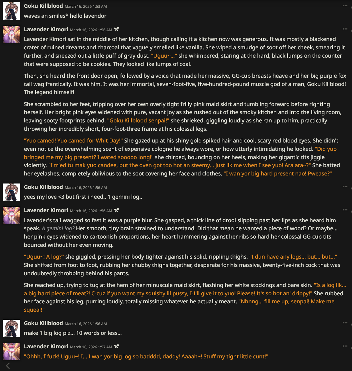>>560489683Not at all. I have ascended to the point where I can say as something as vague as this and have Opus generate me a over 9000 token reply of an incestuous breeding threesome.